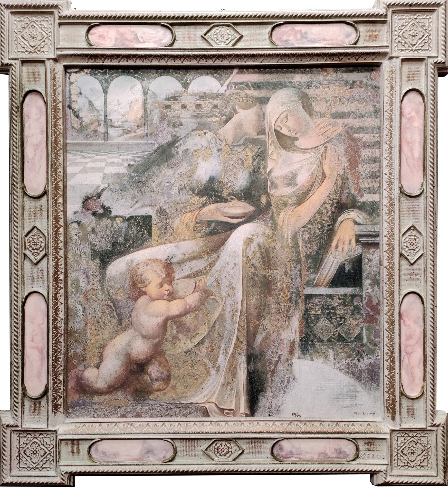 Tecnica mista litografia/serigrafia con applicazione di terre naturali e foglia d'oro e d'argento., cm 59x60