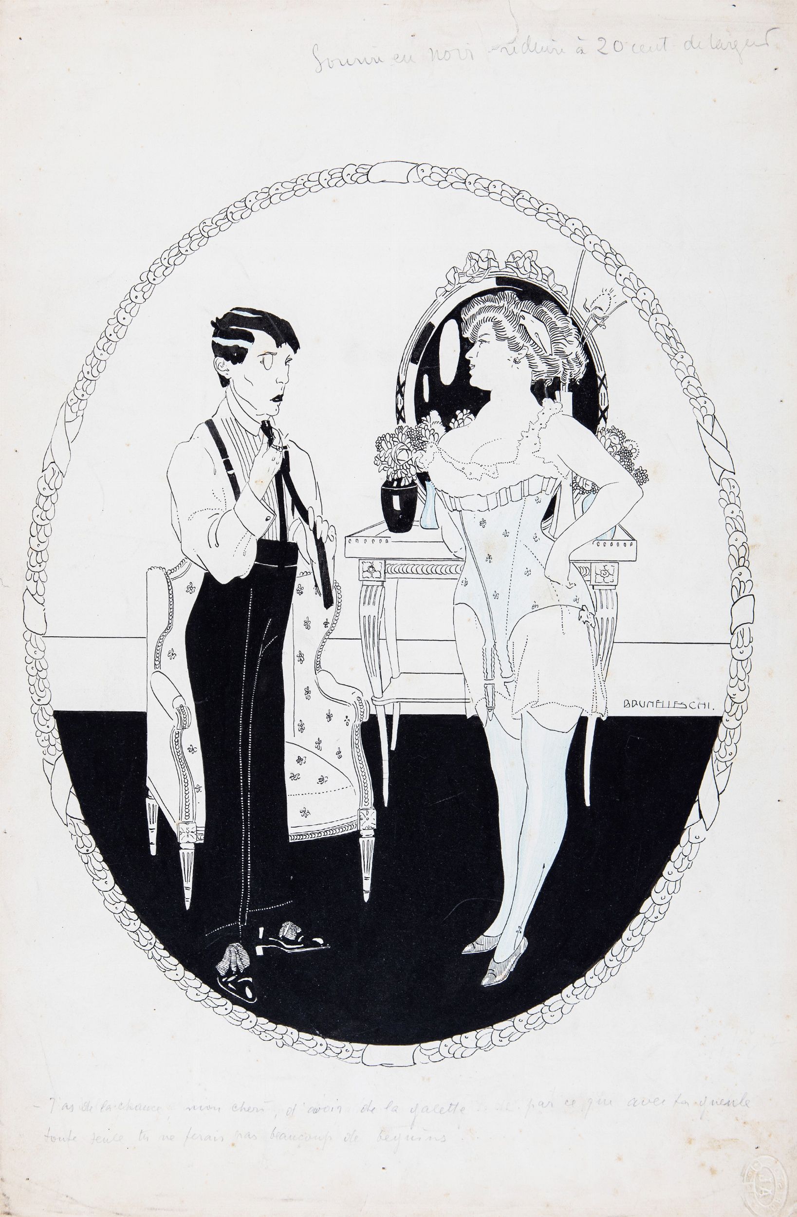 matita e china su cartoncino, 31,5 x 48 cm 1909 Illustrazione originale realizzata da Brunelleschi nel 1909 per la celebre rivista francese Le Rire. Lieve piega orizzontale e piccoli strappi al margine superiore, Fori di affissine ai margini. Firmata.