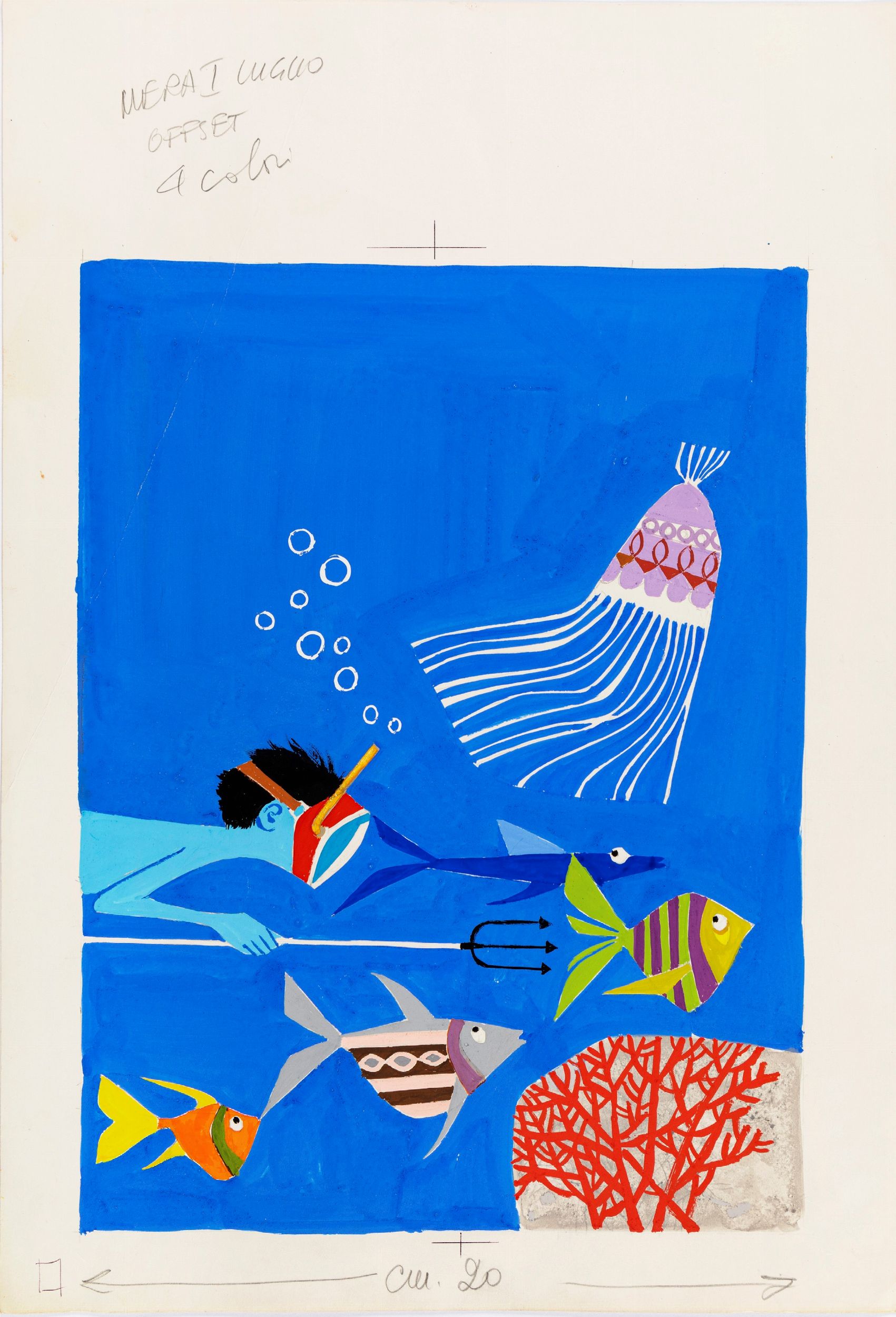 tempera su cartoncino, 34 x 50 cm anni '60 Originale di copertina realizzato da Mancini per il Messaggero dei Ragazzi. Colonna portante della celebre rivista diretta da padre Giovanni Maria Colasanti, Mancini vi collaboṛ dalla metà degli anni ’50 quando ancora si chiamava Sant’Antonio e i fanciulli. Piega all'angolo superiore e inferiore sinistro.