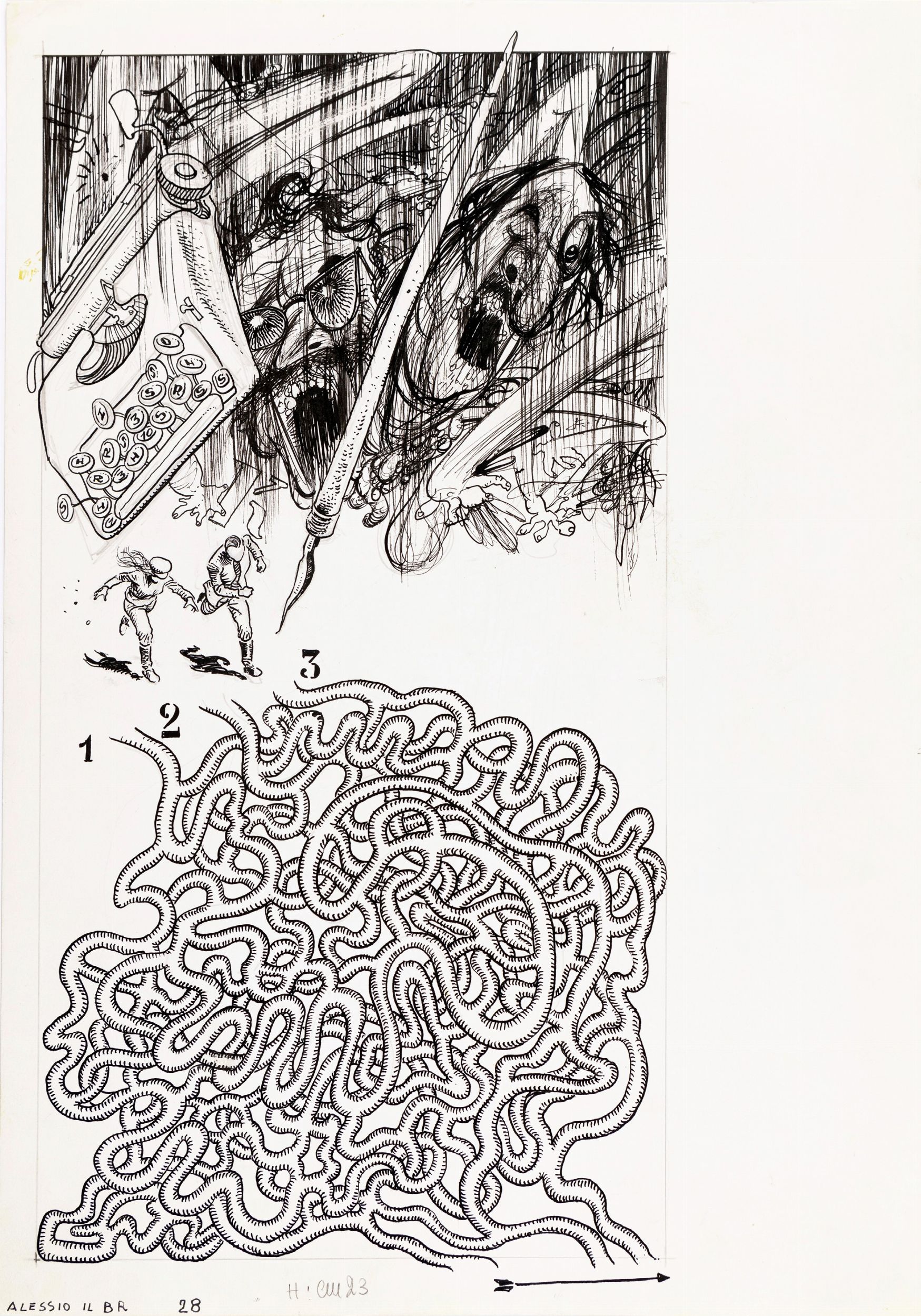 matita e china su cartoncino, 35,5 x 50 cm 1977 Tavola originale realizzata da Manara per Alessio il Borghese rivoluzionario, edita a pag. 28 per la prima volta sulla rivista AlterAlter nel 1977 sui testi di Silverio Pisu. Un'opera dai connotati fortemente politici e tecnicamente tra i migliori lavori di Manara.