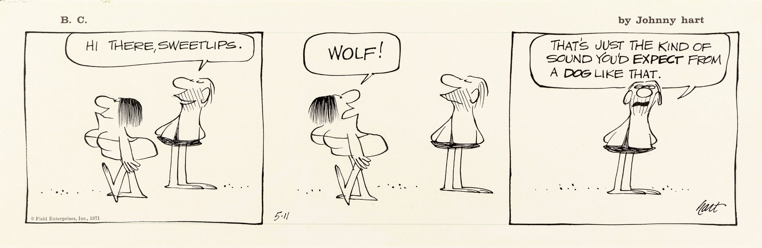 matita e china su cartoncino, 48 x 16 cm 1971 Striscia giornaliera del 11/05/1971 per B.C.. Basata sulla vita di cavernicoli alle prese con problemi giornalieri ed esistenziali di ogni genere, B.C. resta una delle strisce più amate dai lettori di ogni generazione. Firmata e datata.