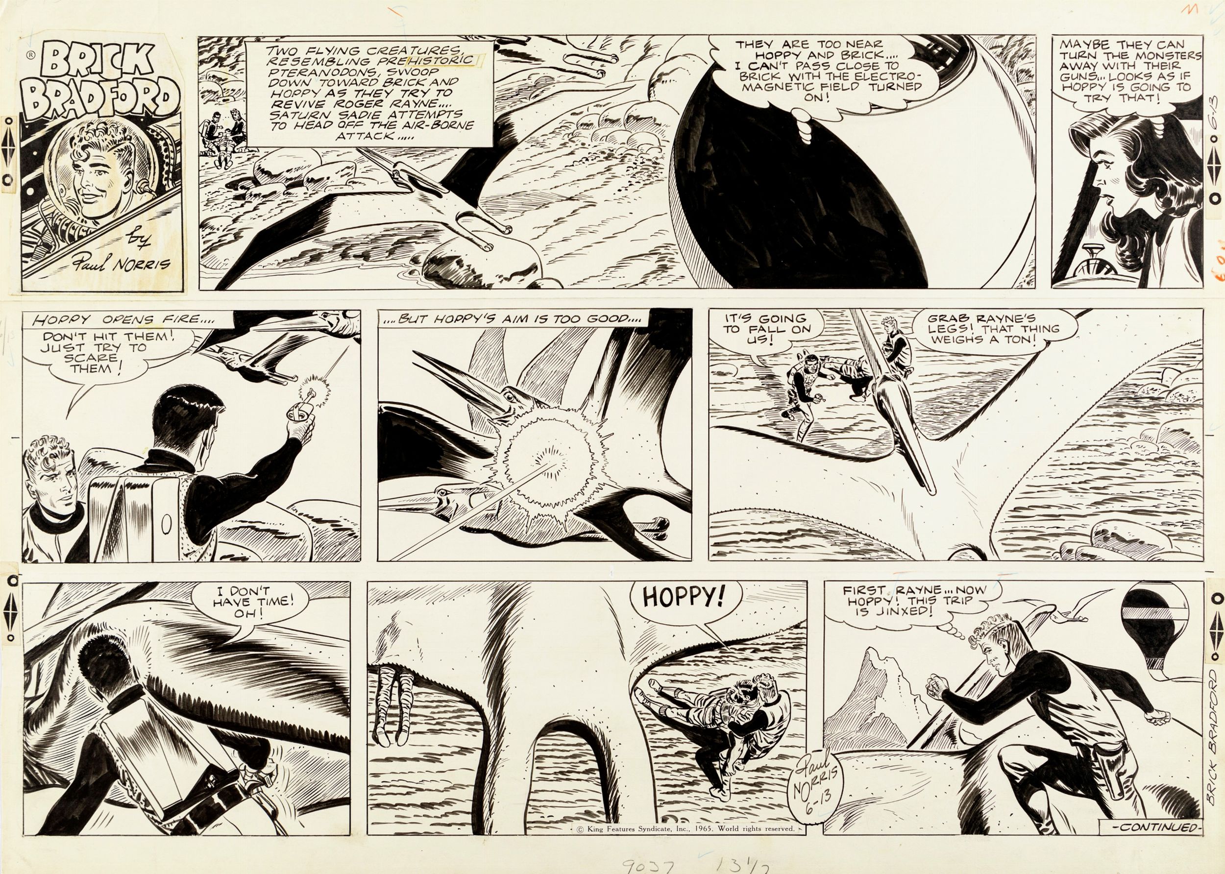 1965 Tavola domenicale del 13/06/1965 per Brick Bradford. Due pieghe orizzontali. Firmata e datata.