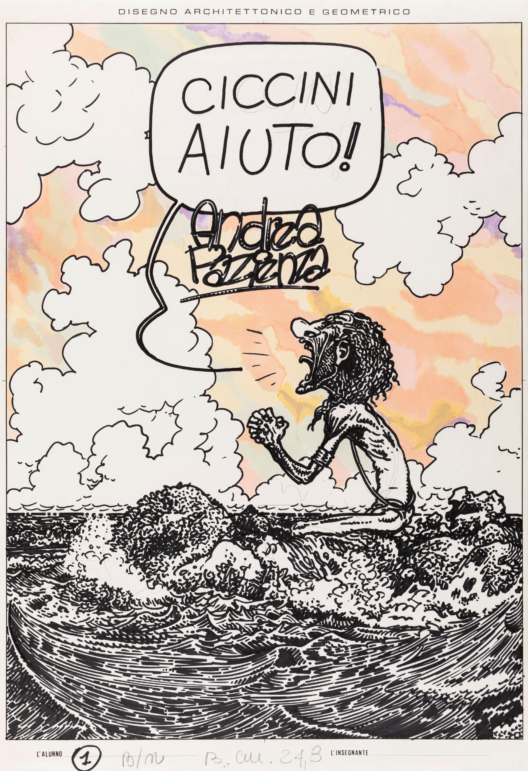 matita e pennarelli su cartoncino, 33 x 48 cm 1985 Illustrazione originale realizzata da Pazienza e pubblicata come frontespizio per il celebre volume Tormenta dalla Milano Libri Edizioni nel 1985. L'opera è stata pubblicata successivamente sul Glamour Book 2 nel 1986 e infine sul volume Andrea Pazienza Antologica a pag. 89 da Baldini e Castoldi nel 1998. Una tra le immagini più iconiche dell'intera produzione di Pazienza; il grido di aiuto di un uomo in balia tra le onde della vita, un'opera che potremmo considerare tragicamente autobiografica. Firmata.