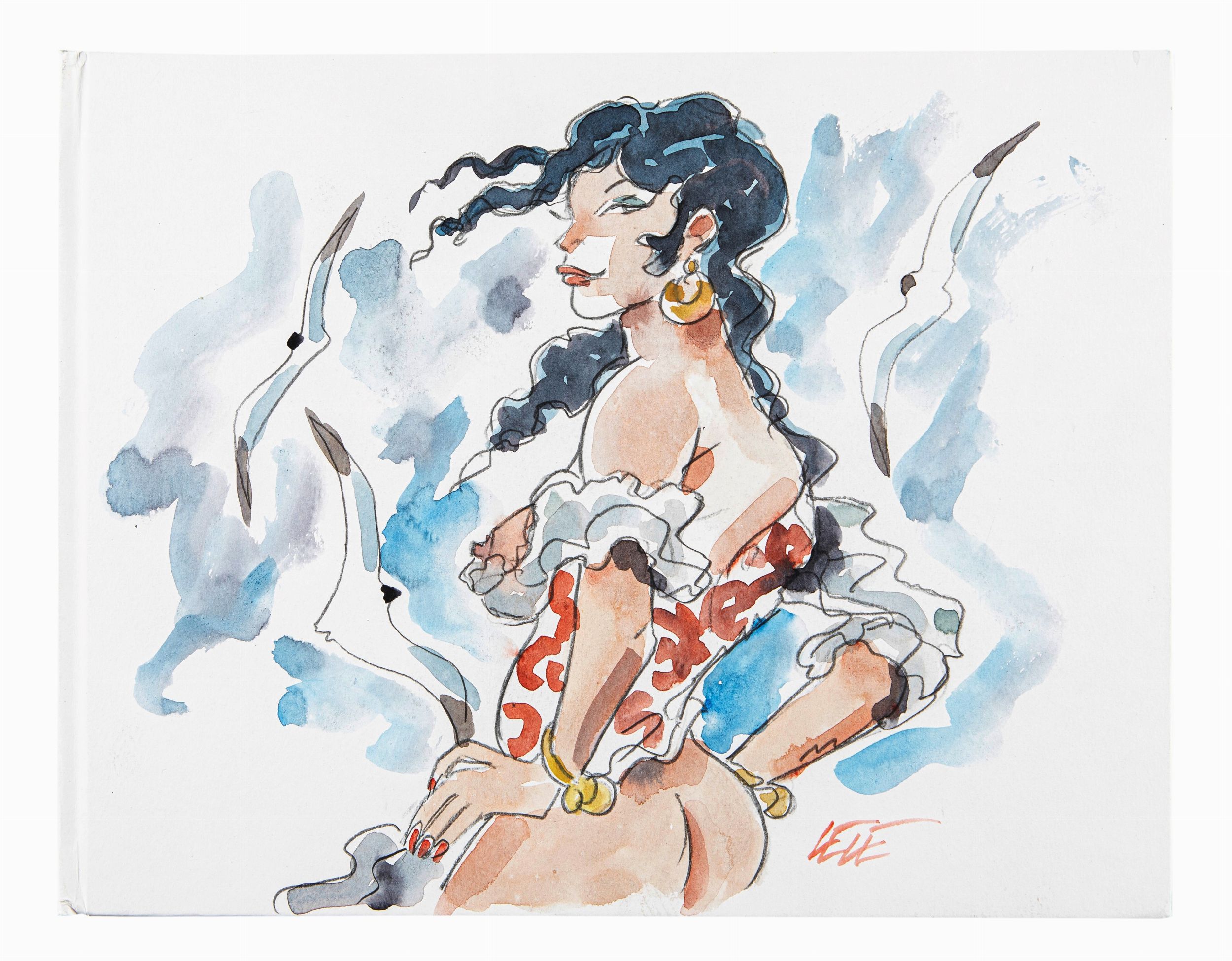 matita e acquerello su cartone, 29 x 23 cm 2013 Disegno originale realizzato da Vianello sulla copertina del volume Lele Vianello edito in tiratura limitata (nostra è la tiratura di testa XVII/XXX) in cofanetto editoriale da Segni d´Autore nel 2013. Firmato.