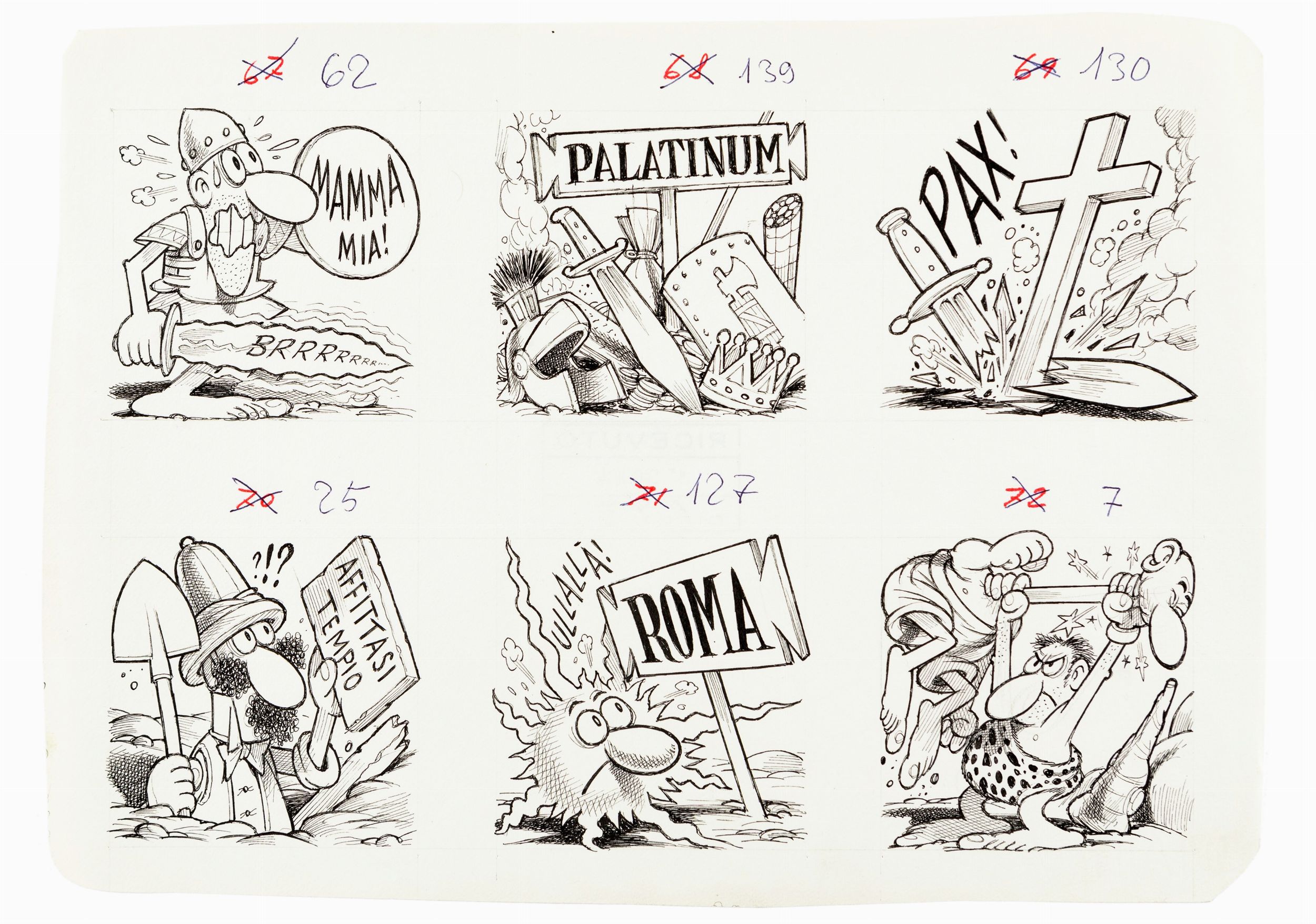 1964 Disegno originale realizzato da Jacovitti contenente 6 vignette originali pubblicate sulle pagine del Diario Vitt 1964/1965 dalle Edizioni AVE. Timbro editoriale al retro.