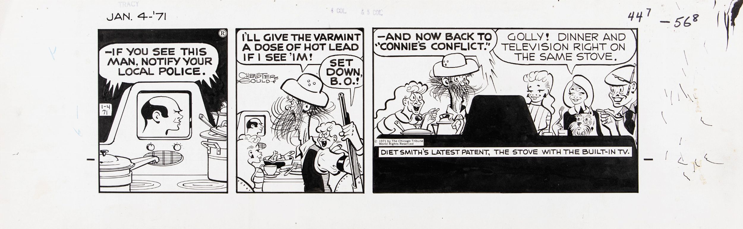 matita e china su cartoncino, 58,5 x 18,5 cm 1971 Striscia giornaliera del 04/01/1971 per Dick Tracy. Apparsa per la prima volta nel 1931, questa striscia divenne rapidamente un'icona della cultura popolare americana e contribuì a stabilire un nuovo standard per i crime comics. Firmata e datata.