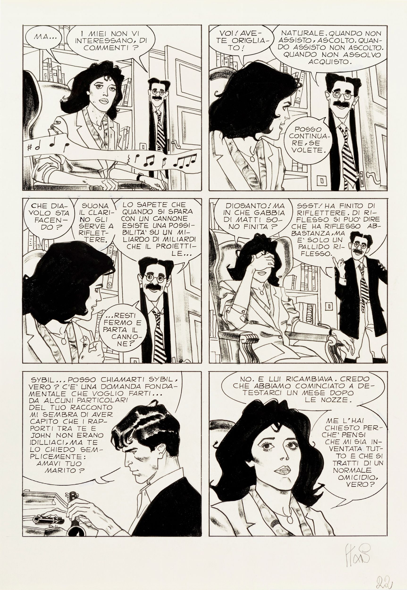matita e china su cartoncino, 35 x 50 cm 1986 Tavola originale realizzata da Stano per L'alba dei morti viventi, edita su Dylan Dog n. 1 a pag. 22 dalla Bonelli nel 1986. Una pagina iconica in cui per la prima volta veniamo travolti dalla surreale comicità di Groucho, e in cui compaiono la bella Sy