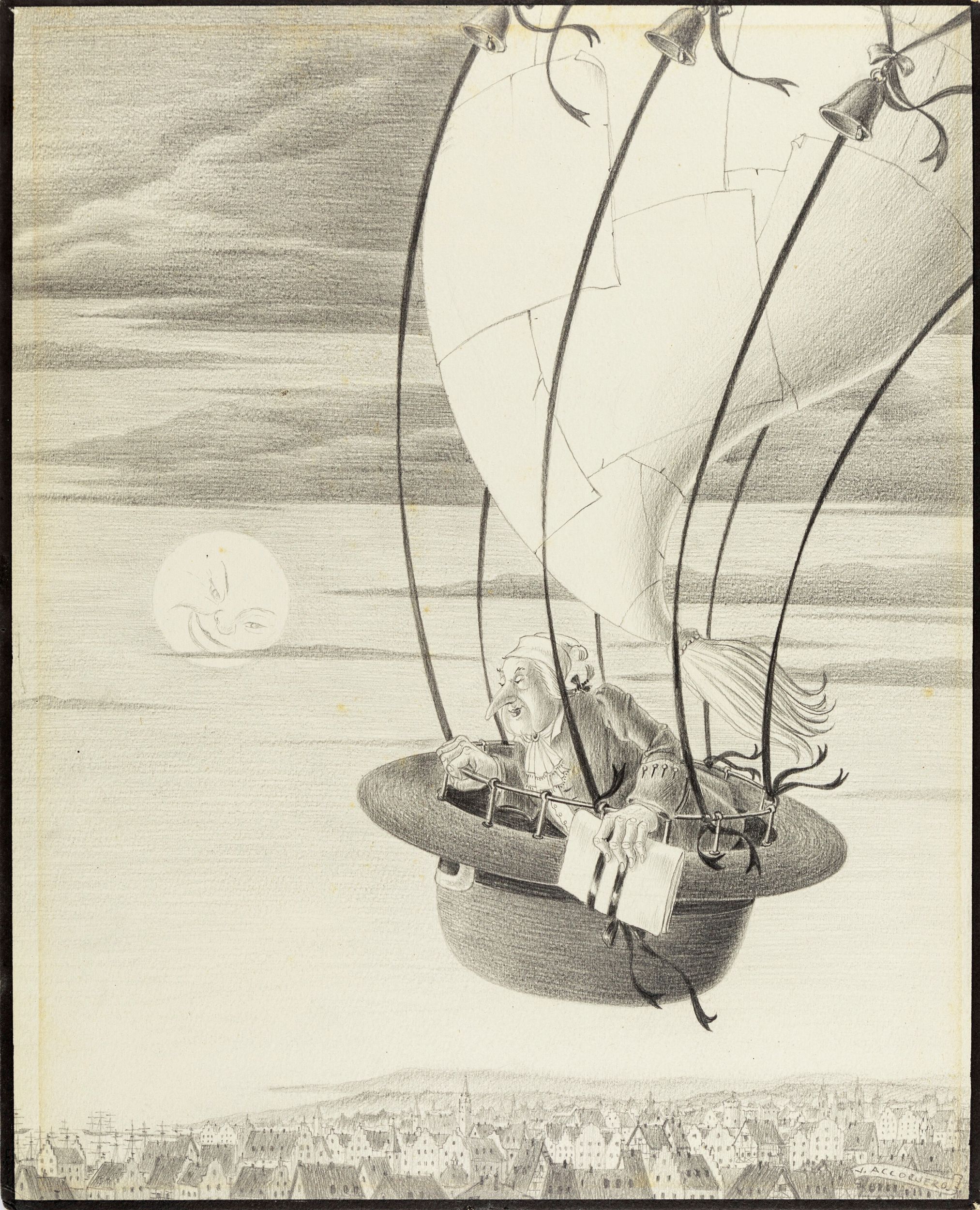 1959 Illustrazione originale realizzata da Accornero per il racconto L'incomparabile avventura di un certo Hans Pfaall di Edgar Allan Poe, edito sui due volumi Racconti Fantastici - Racconti Vari dall'Istituto Editoriale Italiano nel 1959. << Vittorio Accornero ha seguito, con un’acutissima vena fantastica, il muover dolente, allucinato, angoscioso e amaramente voluttuoso dei suoi personaggi, galleggianti, se così può essere detto, in una realtà superiore, nella realtà imponderabile del Sogno >> (dalla prefazione di Orio Vergani). Piccola ammaccatura all'angolo inferiore sinistro. Firmata.