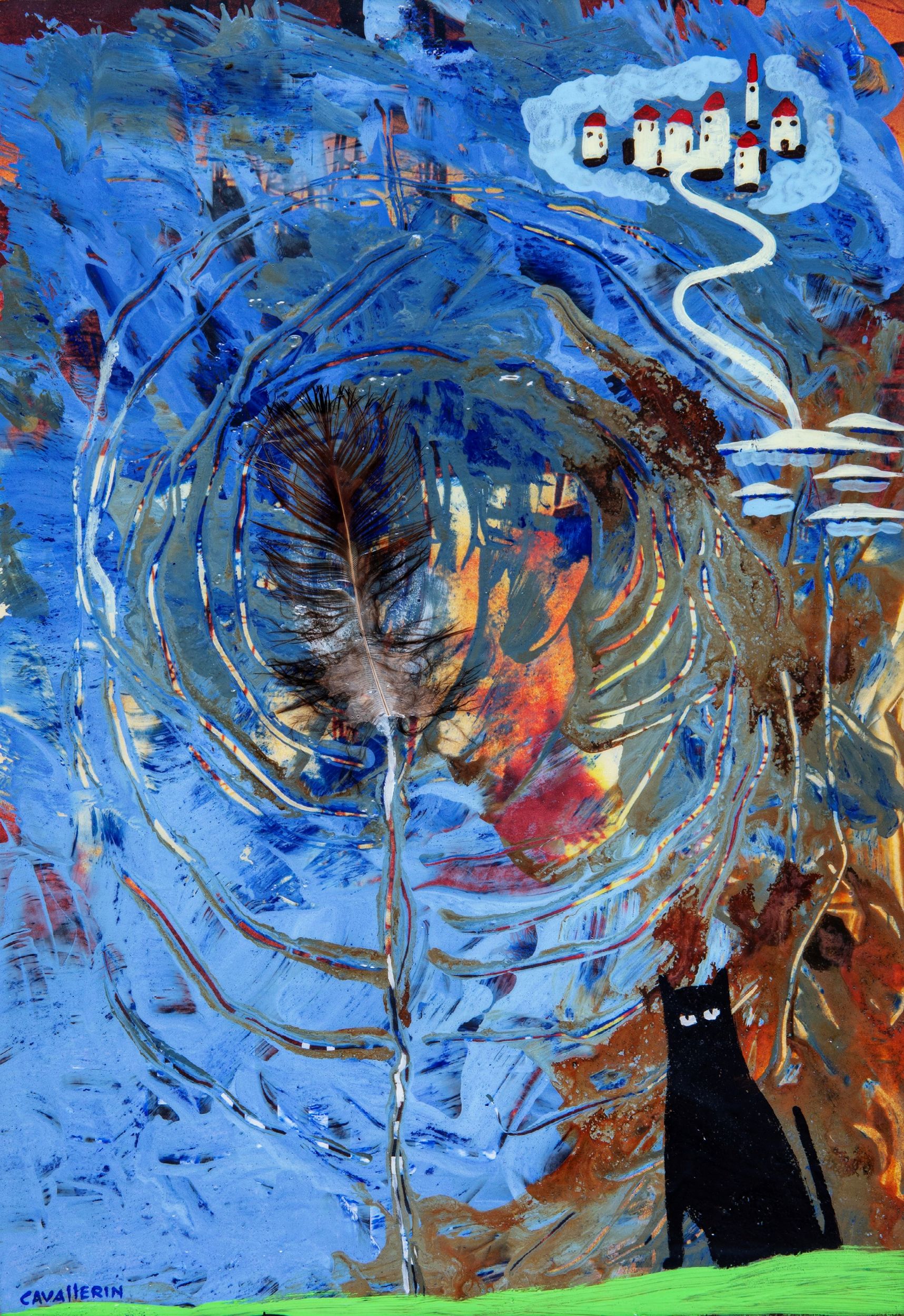 tecnica mista su cartoncino, 21 x 29,5 cm 2007 Illustrazione originale realizzata dall'artista umbro Cavallerin, edita nel volume Felineide da Grifo Edizioni nel 2007. << Ho sempre pensato che i gatti fossero custodi delle porte dei sogni. Cavallerin, con la sua pittura, me lo ha confermato. Insieme alla certezza che i sogni migliori partono tutti da un sofŕ >> (Vincenzo Mollica). Firmata.