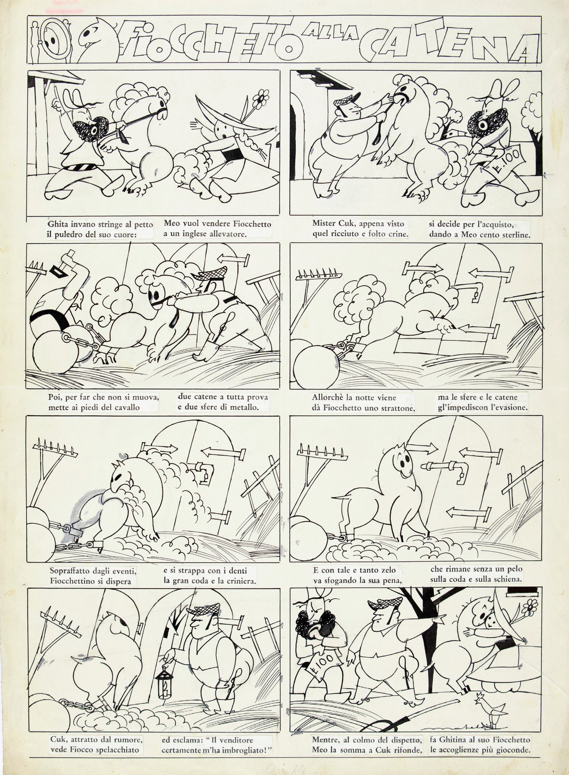 matita e china su cartoncino, 40 x 54,5 cm 1930 Tavola originale realizzata da Mateldi per un'avventura del suo Fiocchetto cavallino storno, intitolata Fiocchetto alla catena, pubblicata sul quindicinale promozionale Mondo Bambino anno I n. 4 dai Grandi Magazzini La Rinascente di Milano nel 1930. Lie