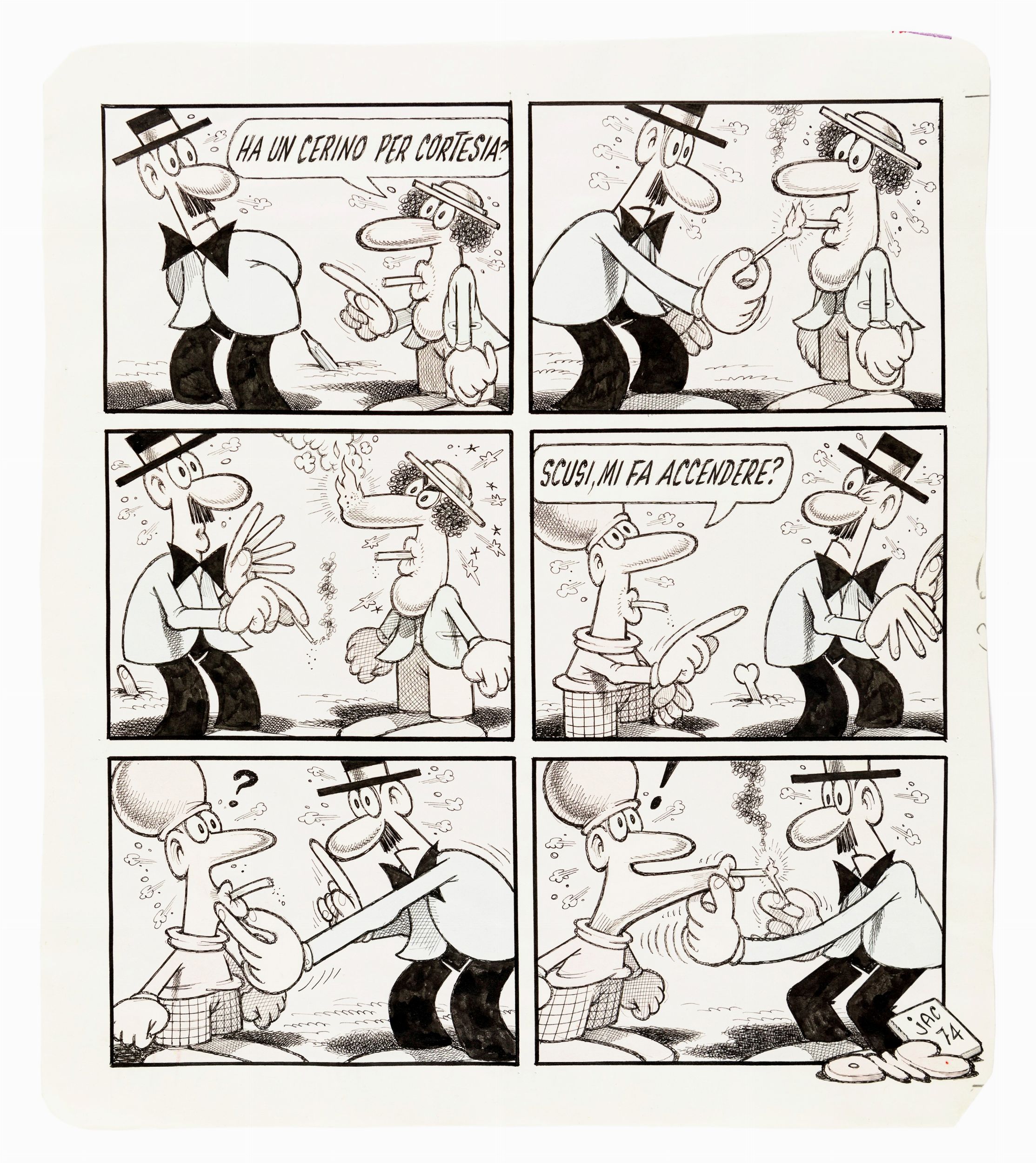 1974 Tavola originale realizzata da Jacovitti per il suo personaggio Giuseppe, pubblicata sulle pagine de La Domenica del Corriere nel 1974. Acquerellata al retro. Firmata con lisca di pesce e datata.