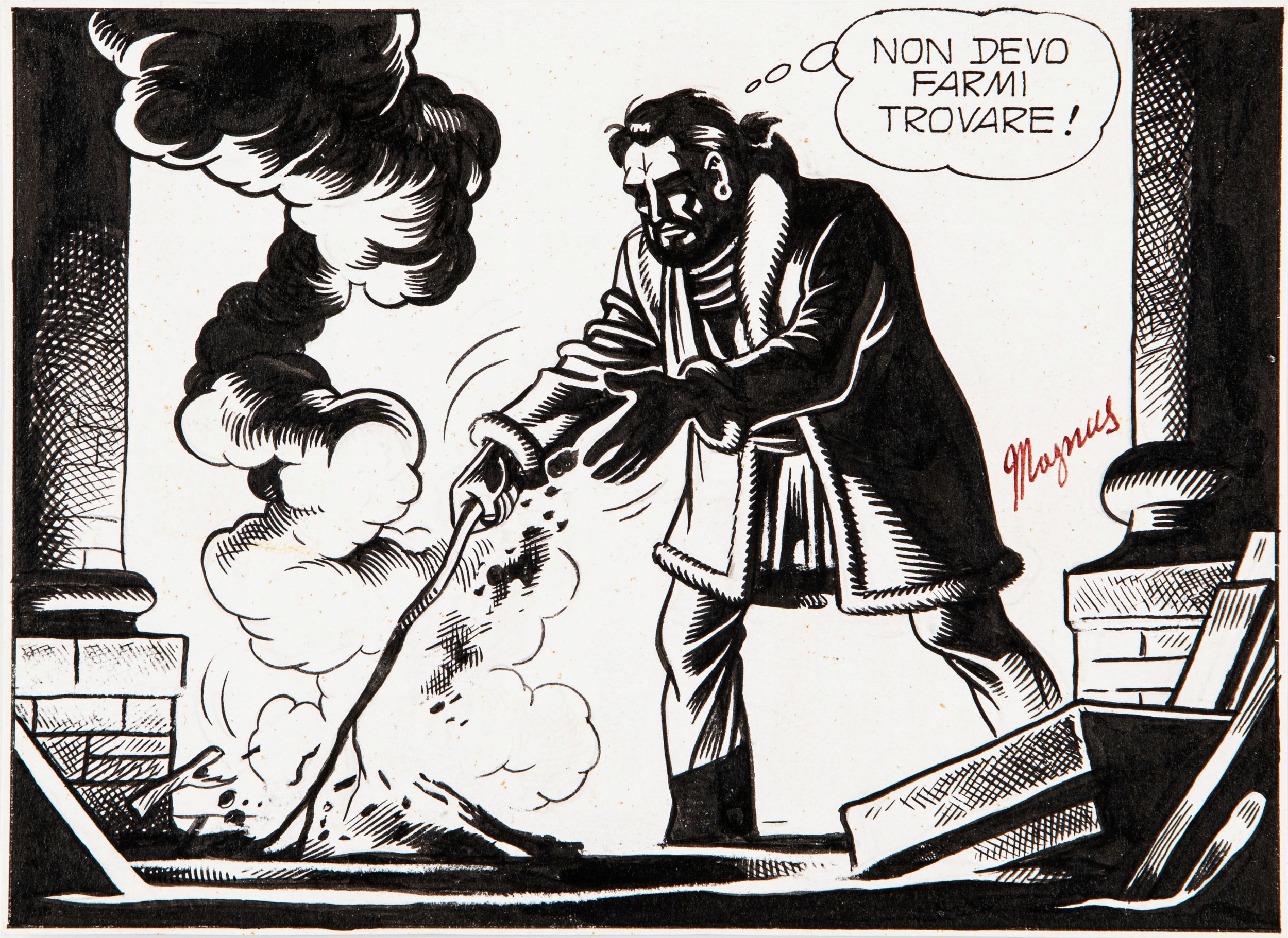 matita e china su cartoncino, 15 x 11 cm 1979 Vignetta originale realizzata da Magnus per Vite perdute contenuta nell’Atto II de I Briganti a pag. 6 e pubblicata per la prima volta dalla Edifumetto nel 1979. La presente vignetta è racchiusa nel folder originale realizzato da Alessandro Editore come certificato d’autenticità nel 2002. Firmata.