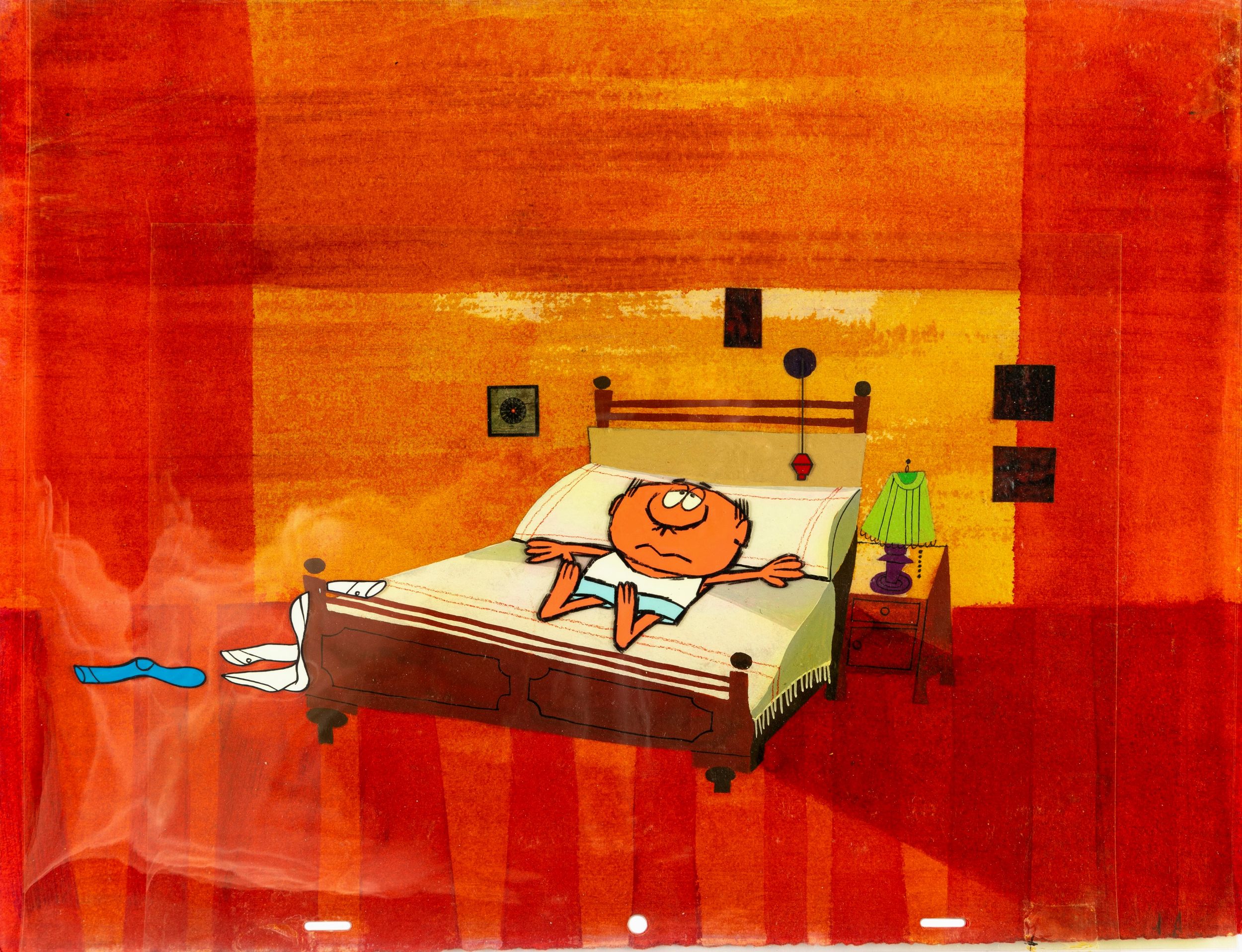 tempera su rodovetro e su cartoncino, 41 x 31,5 cm 1964 Cel originale (tre fogli) su fondale dipinto per il cortometraggio animato Il signor Rossi al mare, prodotto e diretto da Bruno Bozzetto nel 1964. Nel terzo cortometraggio a lui dedicato il signor Rossi parte per una vacanza estiva verso una località turistica molto affollata, affronterà tutti gli ostacoli tipici del posto. Lieve piega ad una cel nell'angolo superiore sinistro. Al retro timbro di produzione. La scena da noi presentata è presente al minuto 9:51 (https://www.youtube.com/watch?v=a7ToqePxW6M&t=351s).