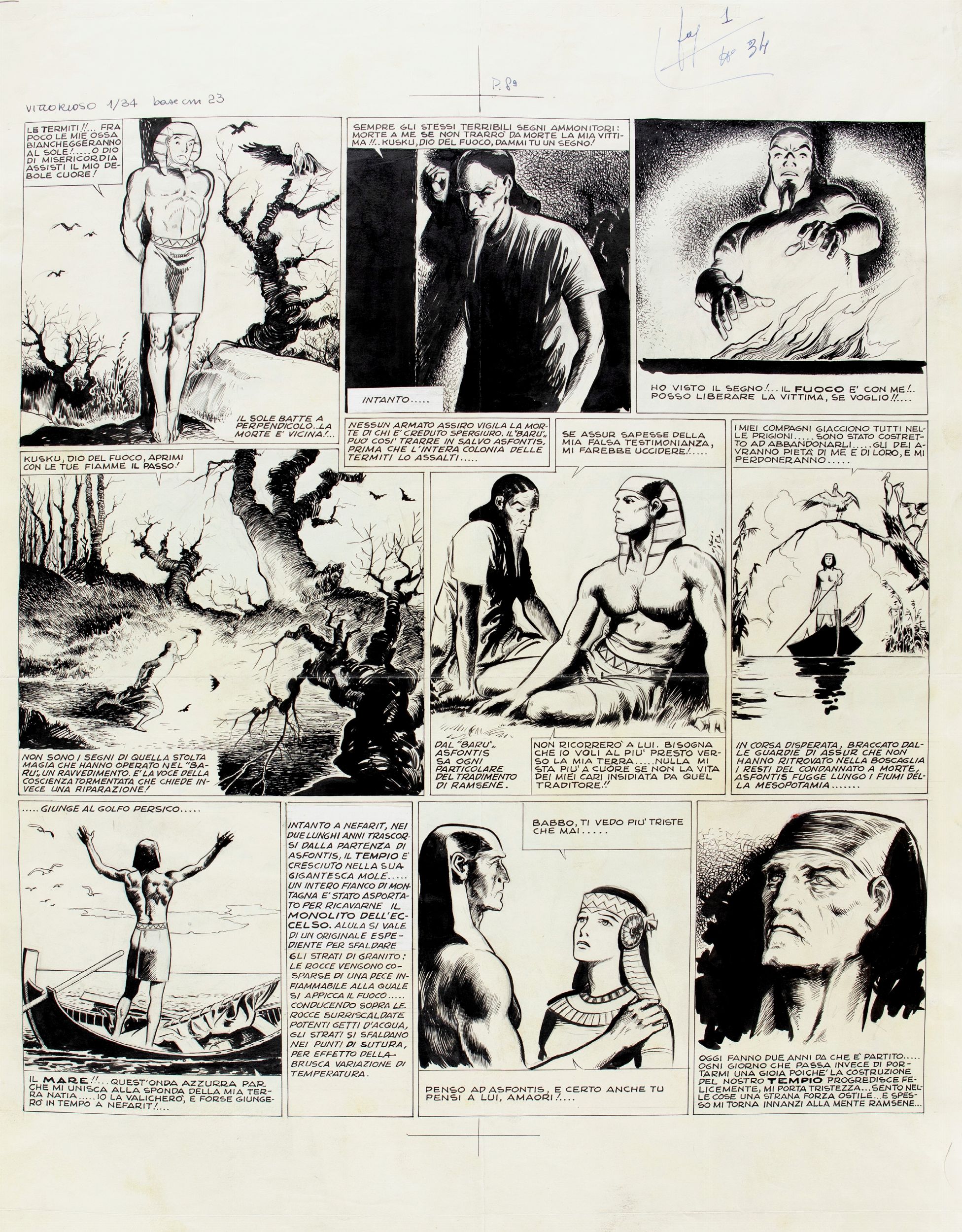 matita e china su cartoncino, 50 x 65 cm 1950 Tavola originale realizzata da De Luca per la pag. 8 de Il tempio delle genti, pubblicata per la prima volta sulle pagine de Il Vittorioso n. 34 nel 1950. Da notate l’uso del chiaroscuro, che spesso De Luca abbandonerà in favore di una sua originale lin