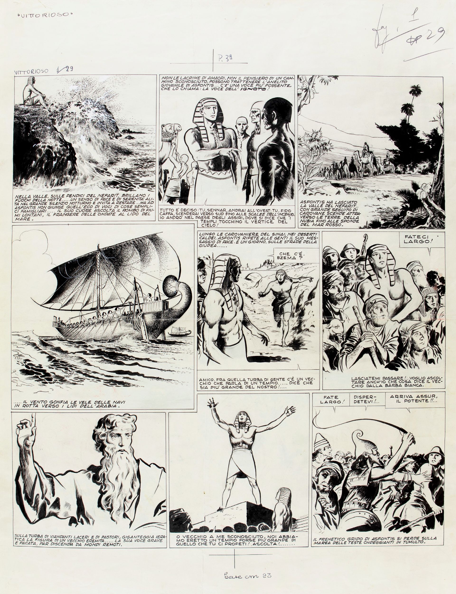 matita e china su cartoncino, 50 x 65 cm 1950 Tavola originale realizzata da De Luca per la pag. 3 de Il tempio delle genti, pubblicata per la prima volta sulle pagine de Il Vittorioso n. 29 nel 1950. Da notate l’uso del chiaroscuro, che spesso De Luca abbandonerà in favore di una sua originale lin