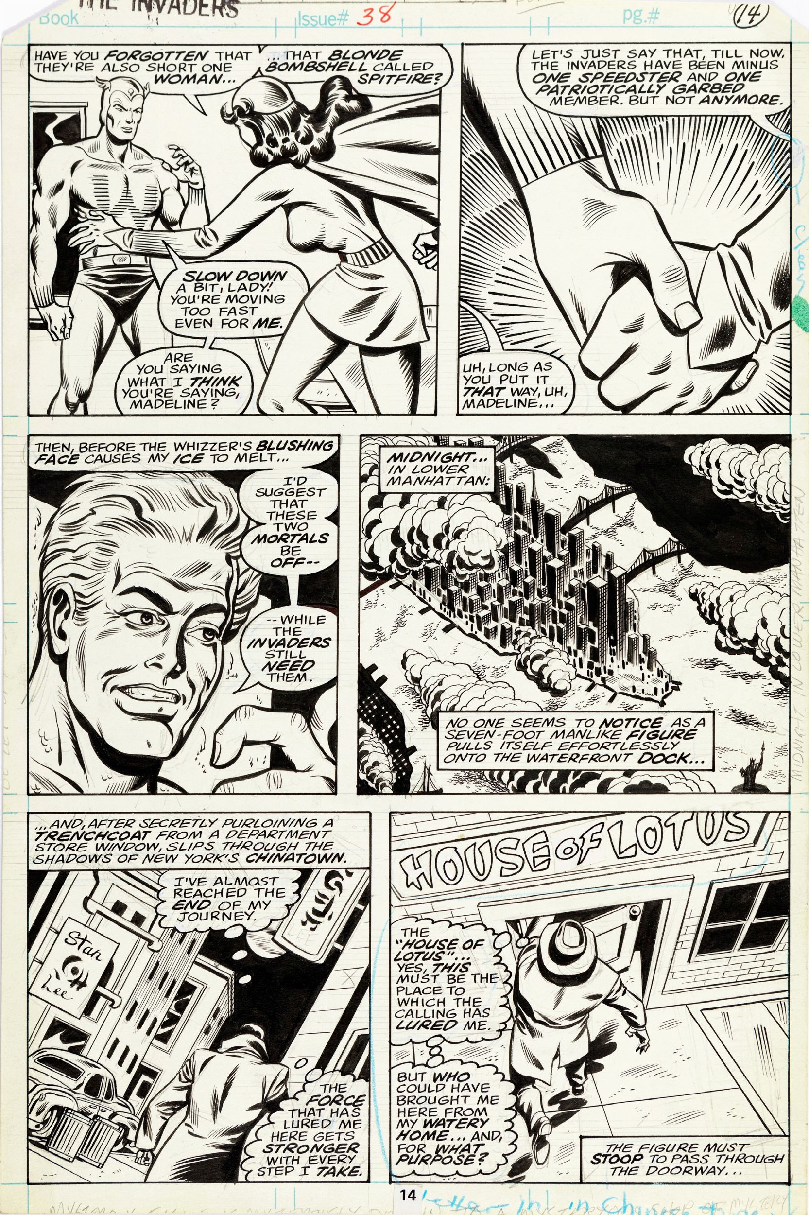 matita e china su cartoncino Marvel, 27 x 40,5 cm 1979 Tavola originale realizzata da Kupperberg per U-Man Comes to Town!, edita su Invaders n. 38 a pag. 14 dalla Marvel nel 1979. Da notare nella quinta vignetta il negozio Stan Lee nel cuore della Chinatown di New York.