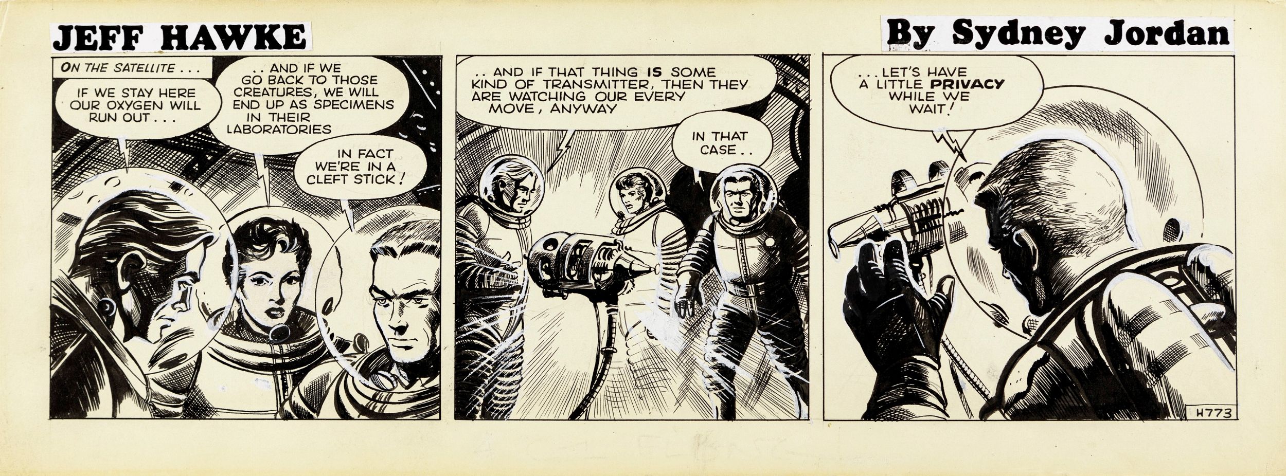 1956 Striscia giornaliera n. H 773 per Jeff Hawke. Firmata al retro.