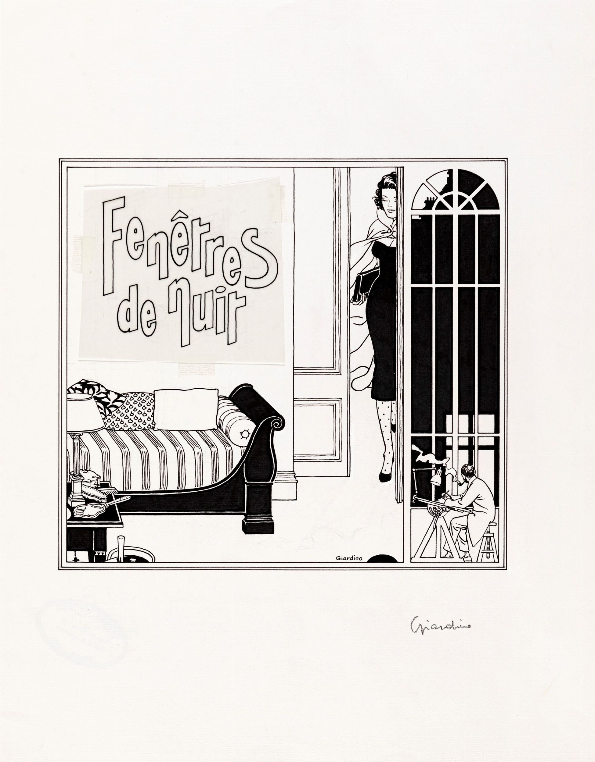 1986 Illustrazione originale realizzata da Giardino per La Finestra di Notte, breve racconto erotico senza testo pubblicato per la prima volta in bianco e nero nel volume Vittorio Giardino Glamour Book edito dalla Glamour International nel 1986. Un'opera raffinata e sensuale che nel 1998 con il titolo Fenêtres de nuit divenne un portfolio contenente 8 serigrafie a colori (riproducendo a colori i disegni dell'86) stampato dalla celebre libreria Raspoutine di Losanna in soli 200 esemplari. Giardino mette in scena la turbolenta notte di un disegnatore (un palese autoritratto) sorpreso a spiare dalla finestra una bellissima fanciulla che diventa inconsapevolmente la sua musa ispiratrice fino ad un brusco epilogo. Firmata al fronte e al retro con timbro dell'artista.