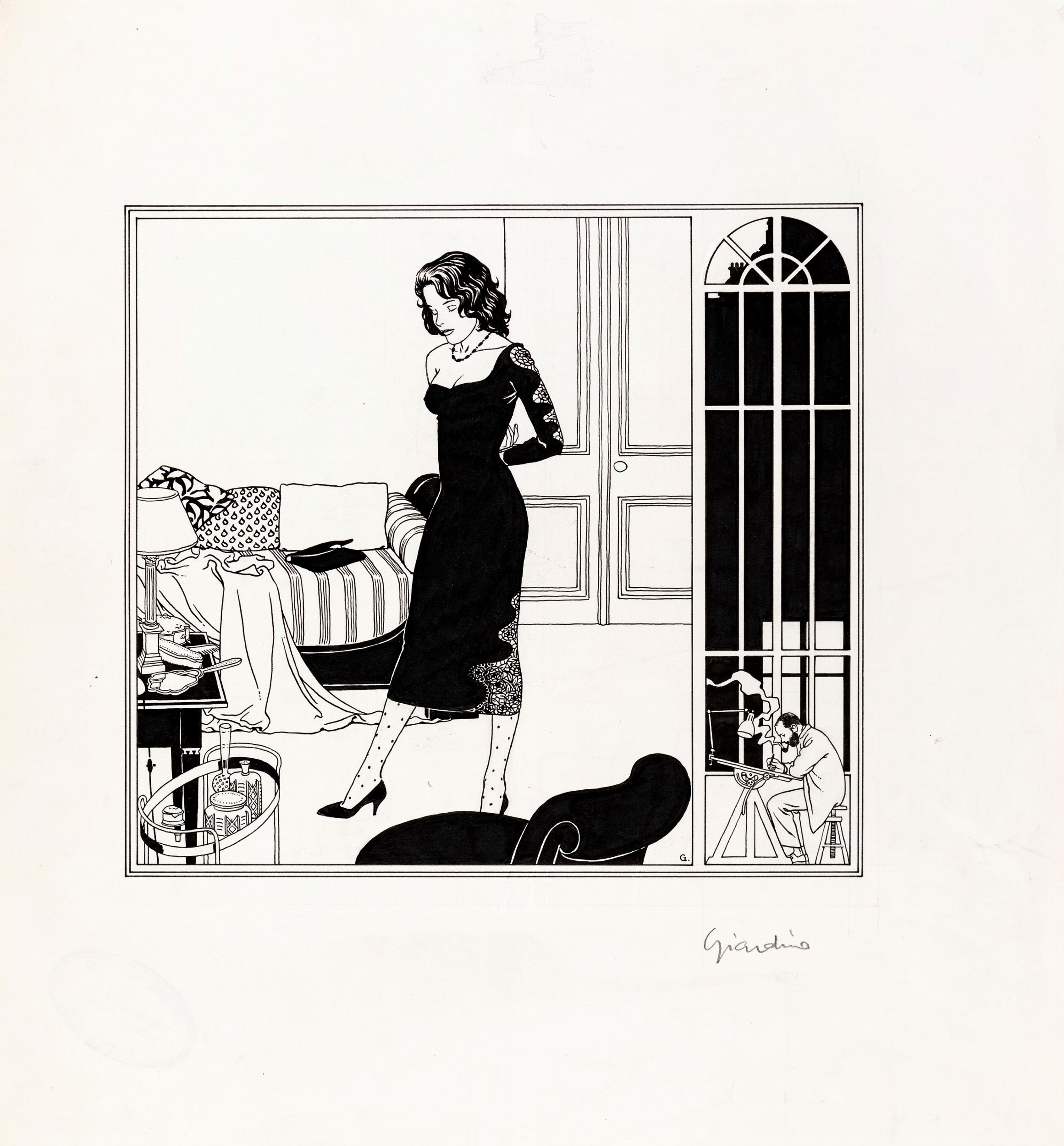 1986 Illustrazione originale realizzata da Giardino per La Finestra di Notte, breve racconto erotico senza testo pubblicato per la prima volta in bianco e nero nel volume Vittorio Giardino Glamour Book edito dalla Glamour International nel 1986. Un'opera raffinata e sensuale che nel 1998 con il titolo Fenêtres de nuit divenne un portfolio contenente 8 serigrafie a colori (riproducendo a colori i disegni dell'86) stampato dalla celebre libreria Raspoutine di Losanna in soli 200 esemplari. Giardino mette in scena la turbolenta notte di un disegnatore (un palese autoritratto) sorpreso a spiare dalla finestra una bellissima fanciulla che diventa inconsapevolmente la sua musa ispiratrice fino ad un brusco epilogo. Firmata al fronte e al retro con timbro dell'artista.