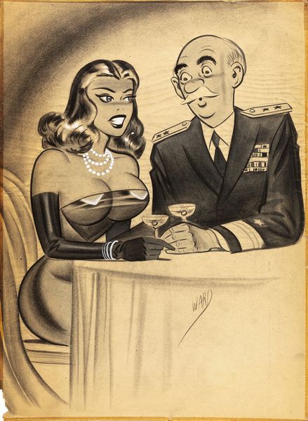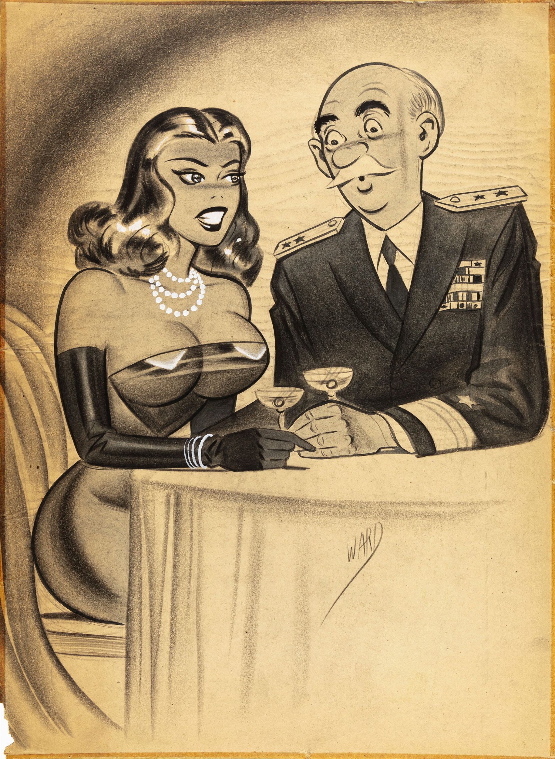 matita, china e acquerello su carta, 42 x 57 cm 1969 Illustrazione originale realizzata da Ward nel 1969 per la rivista maschile Humorama e successivamente pubblicata come copertina per la rivista Joker. Ward iniziò a disegnare le sue pin-up durante la Seconda Guerra Mondiale, creando seducenti ragazze prosperose su tacchi altissimi, calze nere e abiti attillatissimi, influenzando così le fantasie erotiche dell'America del Dopoguerra: il boom delle riviste maschili degli anni '50 non fece che confermare Ward come uno degli artisti più popolari del paese. Piccolo strappo restaurato al margine destro e piccola mancanza all'angolo inferiore sinistro. Firmata al fronte e datata al retro.
