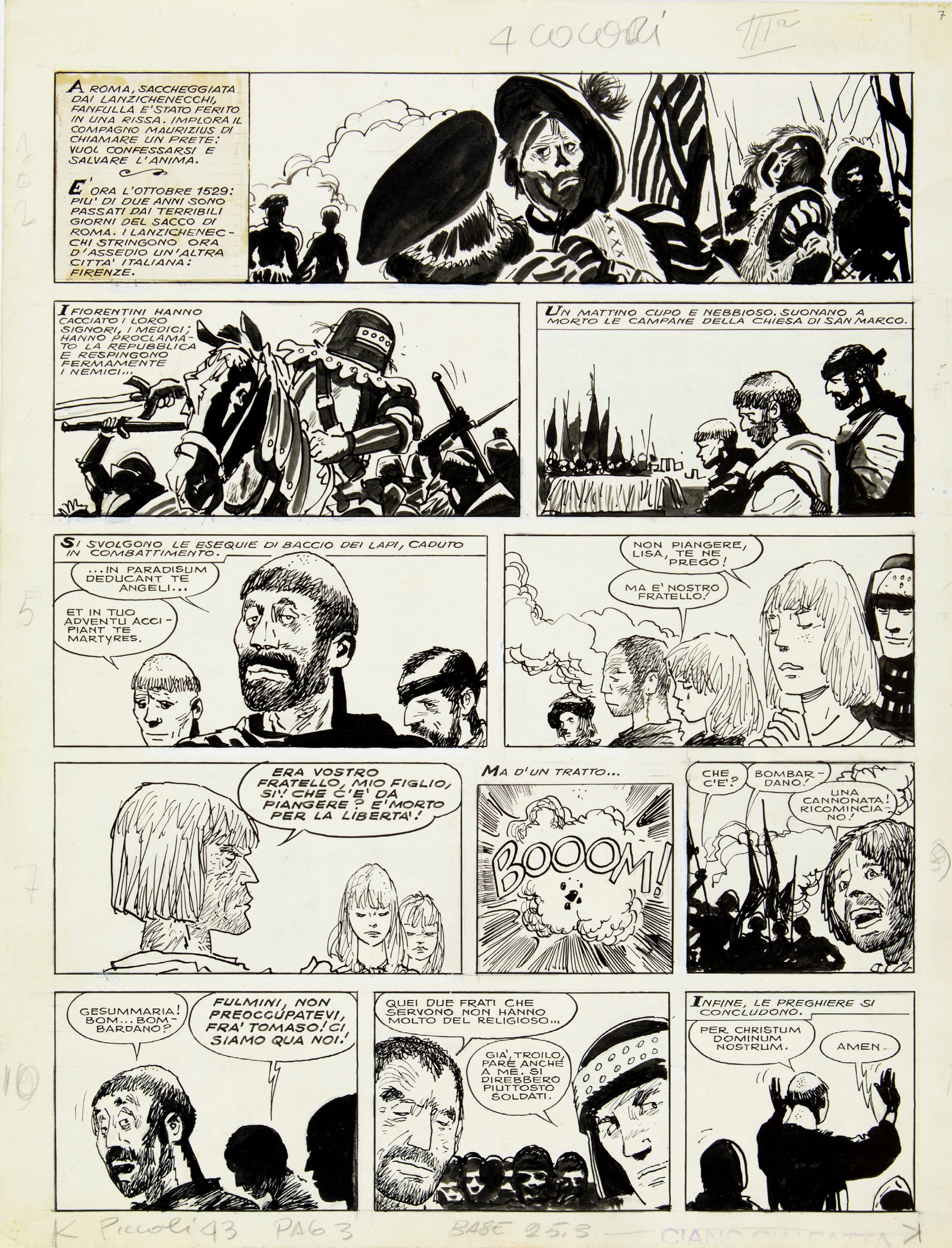 matita e china su cartoncino, 28 x 37 cm 1967 Tavola originale realizzata da Pratt per Le avventure di Fanfulla, pag. 7 di questa avventura che narra le gesta del soldato di ventura Fanfulla da Lodi, pubblicata per la prima volta a episodi sulle pagine del CdP tra il 1967 e il 1968. Colorata al ret