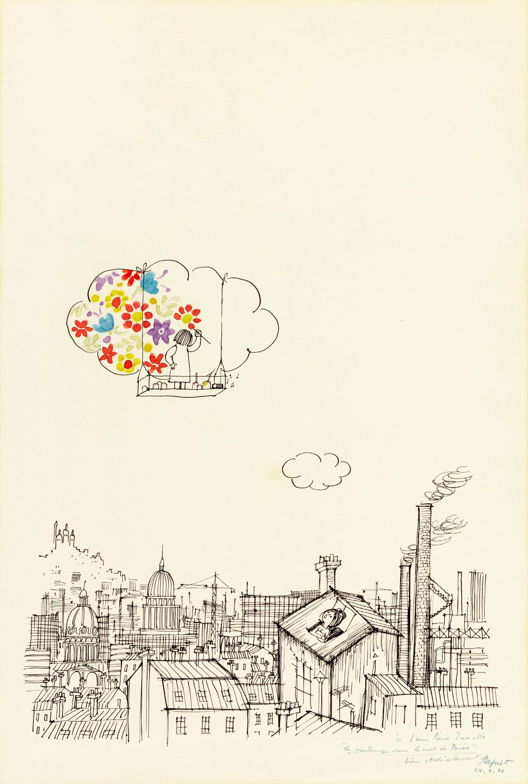 matita, china e acquerello su cartoncino, 27 x 40 cm 1970 Illustrazione originale realizzata da Peynet nel 1970, raffigurante i suoi celebri Innamorati la coppia di giovani fidanzatini più riprodotta al mondo. Un pezzo da museo. Firmata, datata, titolata e dedicata.