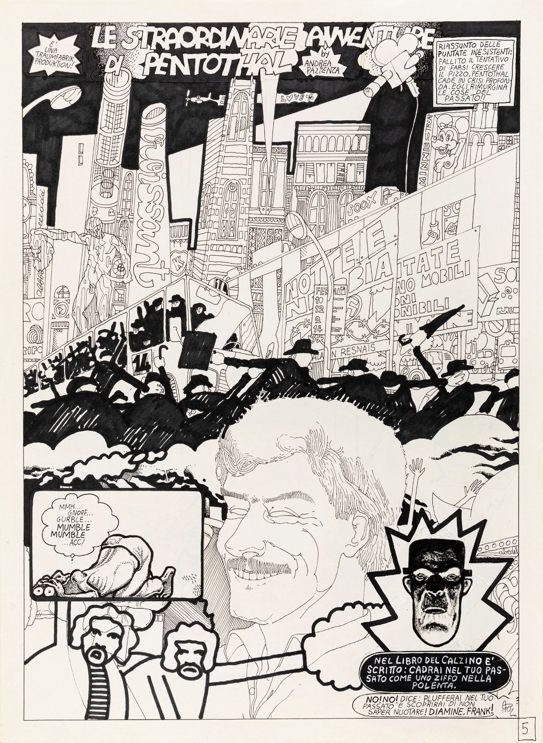 1977 Tavola originale realizzata da Pazienza per la sua opera prima Le straordinarie avventure di Pentothal (tav. 33) edita per la prima volta sulla rivista Alter Alter nel 1977. Le straordinarie avventure di Pentothal, opera realizzata da Pazienza a soli 21 anni, è il diario minuzioso dei sogni, le illusioni e le contraddizioni del suo autore e di un'intera generazione, quella della Bologna del 1977. Il linguaggio è un tripudio di slang, onomatopee, neologismi e sgrammaticature. Il tratto grafico è una felice anarchia espressiva tra suggestioni della Pop art e tratteggi ariosi sul modello di Moebius. Firmata.