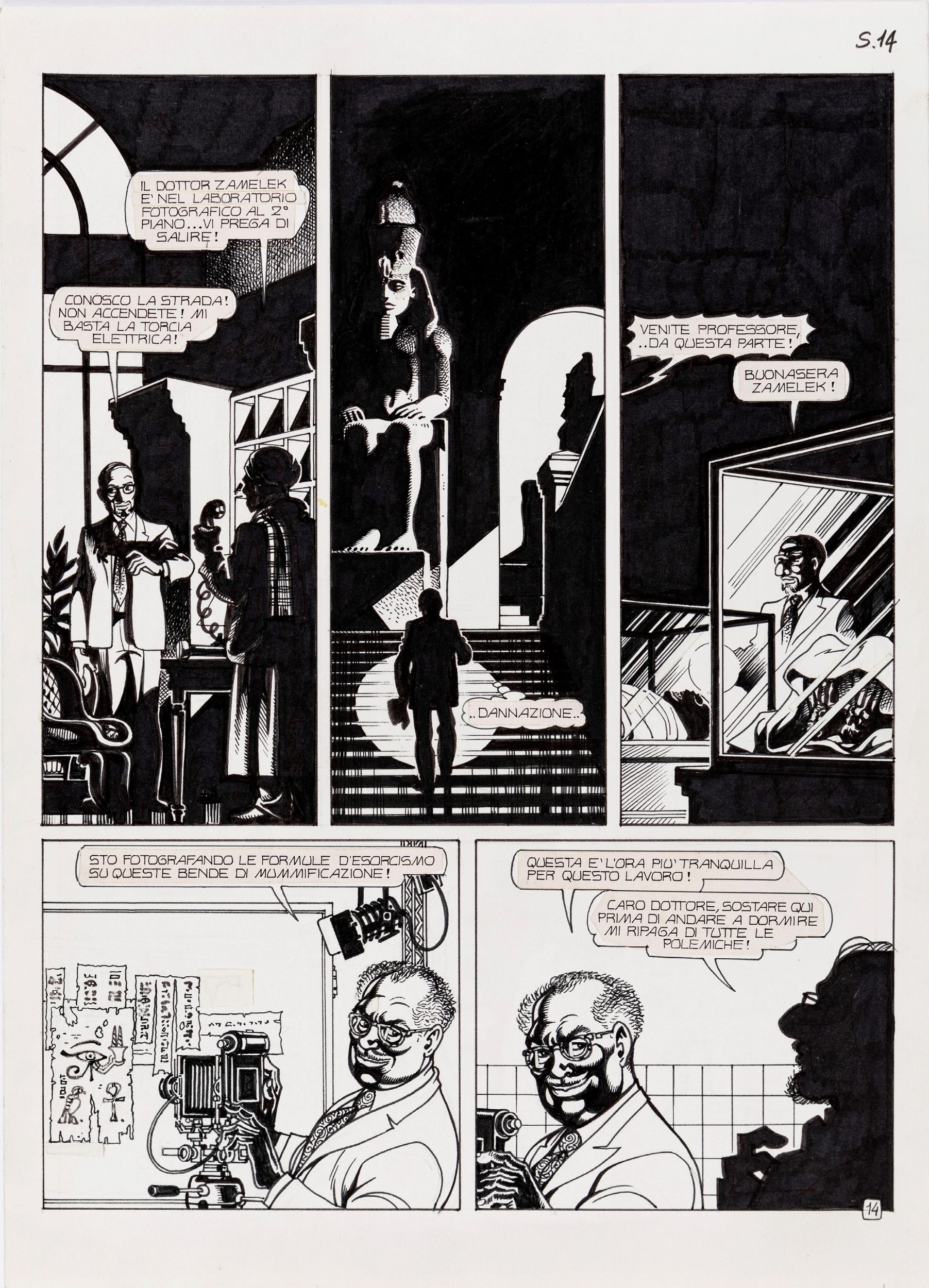 matita e china su cartoncino, 29 x 40 cm 1982 Tavola originale realizzata da Magnus per Full Moon in Dendera, pubblicata per la prima volta a pag. 14 sulle pagine di Orient Express n. 2 nel 1982. L'amore di Magnus per le atmosfere misteriose traspare nella prime vignette di questa pagina con il professor Champollion che cammina di notte tra le mummie del museo de Il Cairo.