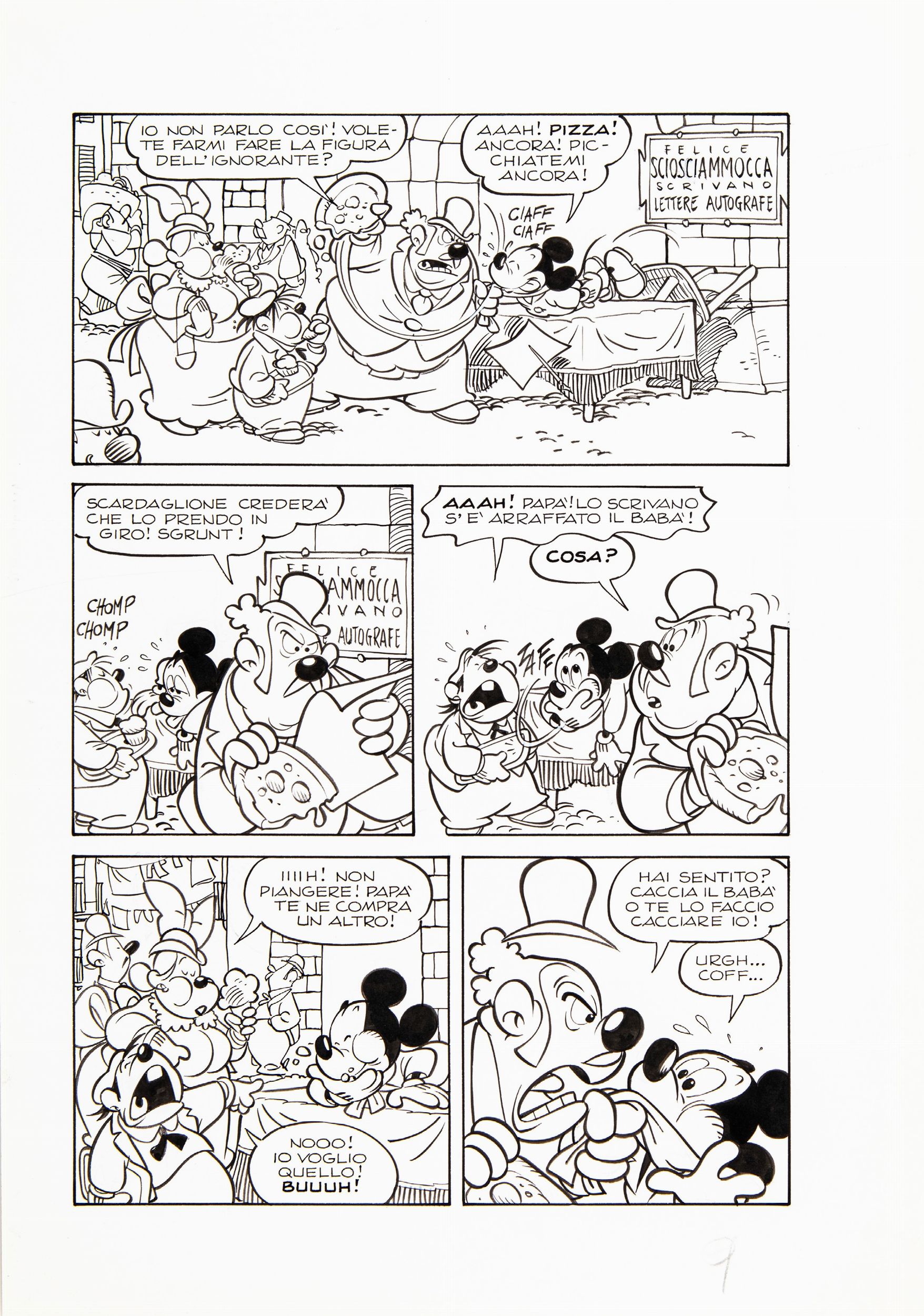 matita e china su cartoncino, 25,5 x 36,5 cm 1993 Tavola originale realizzata da Cavazzano per Il Teatro Alambrah presenta: Miseria e nobiltà di Eduardo Scarpetta, edita su Topolino n. 1955 a pag. 9 nel Maggio 1993. Una storia già entrata nella leggenda come una delle migliori parodie Disney di sempre, sui testi di Francesco Artibani e dell ’attore Lello Arena.
