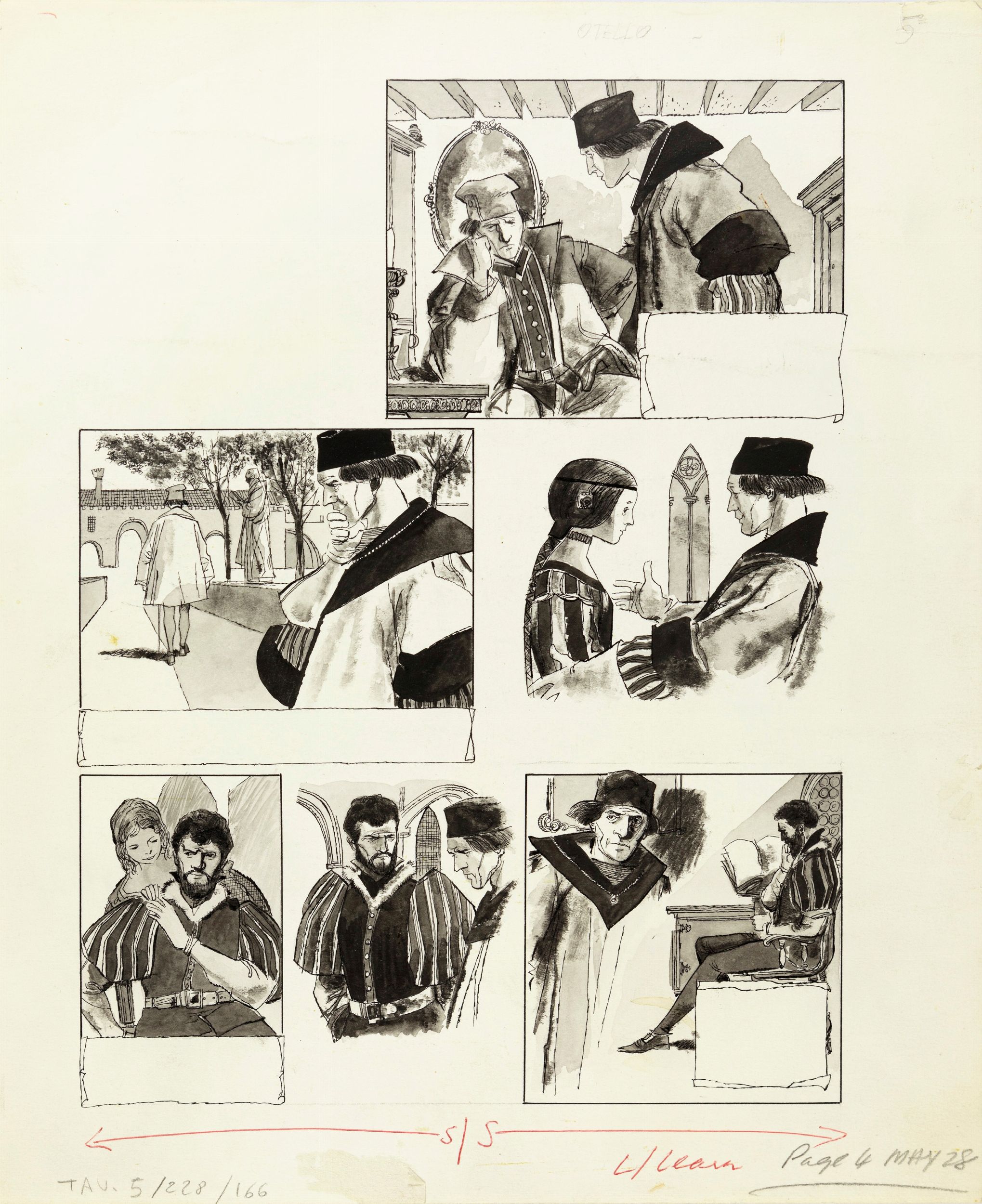 matita, china e acquerello su cartoncino, 30,5 x 36,5 cm 1966 Tavola originale realizzata da Battaglia per Othello: The Moor of Venice, quinto episodio per l´adattamento del classico shakespeariano pubblicato sul magazine inglese Look and Learn n. 228 nel Maggio 1966. Piccolo strappo al margine superiore.