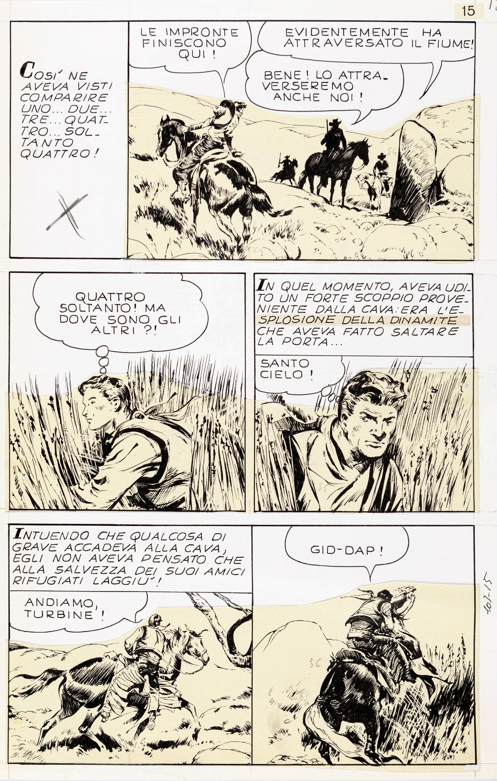 matita e china su cartoncino rimontato, 21,5 x 33 cm 1954 Tavola originale realizzata da Battaglia per ll deserto dipinto, edita per la prima volta su Albi della Prateria n. 5 nel 1954 e rimontata per la ristampa della Mondadori su Pecos Bill n. 103 a pag. 15 nel 1962. Due pieghe orizzontali.
