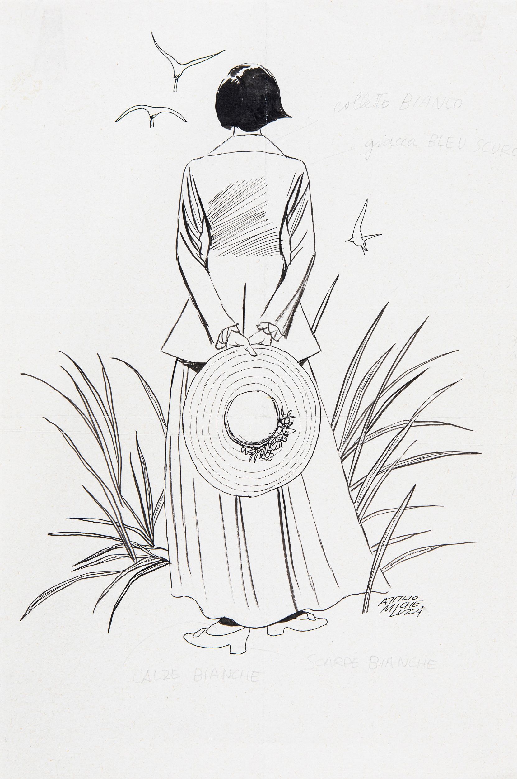 matita e china su carta, 25 x 37,5 cm 1977 Illustrazione originale realizzata da Milazzo per la pagina pubblicitaria che annunciava la prossima pubblicazione del suo nuovo personaggio Petra Chérie, edita su Il Giornalino n. 5 del 30 Gennaio 1977. Quella da noi presentata è la prima immagine in assoluto mai pubblicata di Petra Chérie, Petra De Karlowitz (chiamata Chérie dal suo autore) esordì infatti su Il Giornalino con l'avventura Dolci nebbie di Fiandra il 20 Febbraio 1977. Due pieghe orizzontali e una verticale al centro. Firmata.