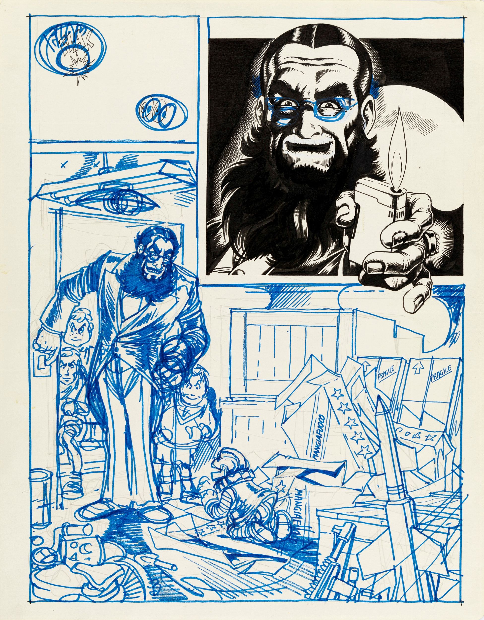 matita, china e pennarello su cartoncino, 32 x 41 cm 1973 Tavola preliminare realizzata da Magnus nel 1973 per una delle quattro tavole della sua leggendaria rivisitazione di Pinocchio, progetto incompiuto nato da un’idea di Max Bunker. Un Pinocchio moderno in cui il burattino di legno diventa un robot di latta e il Mangiafuoco di collodiana memoria si trasforma in un impresario teatrale senza scrupoli in doppiopetto. La tavola definitiva è pubblicata sulla monografia della Glittering Images a pag. 77 nel 1997. Piega orizzontale al centro.