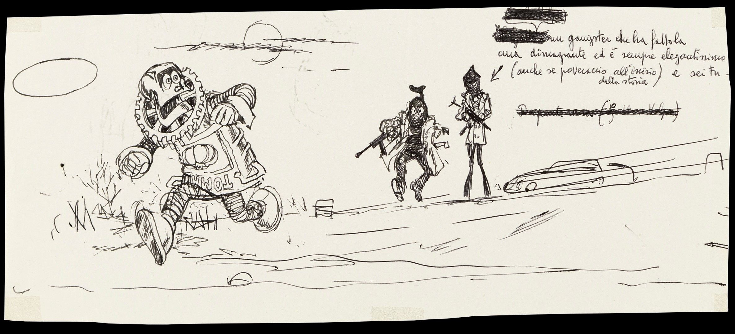 matita e biro su carta, a) 26,5 x 11,5 cm b) 10 x 11,5 cm 1973 Coppia di disegni preliminari realizzati da Magnus nel 1973 per la sua leggendaria rivisitazione di Pinocchio, progetto incompiuto nato da un’idea di Max Bunker di cui il maestro bolognese disegnò solo quattro tavole. Un Pinocchio moderno in cui il burattino di legno diventa un robot di latta e il Gatto e la Volpe di collodiana memoria si trasformano in due spietati gangster.
