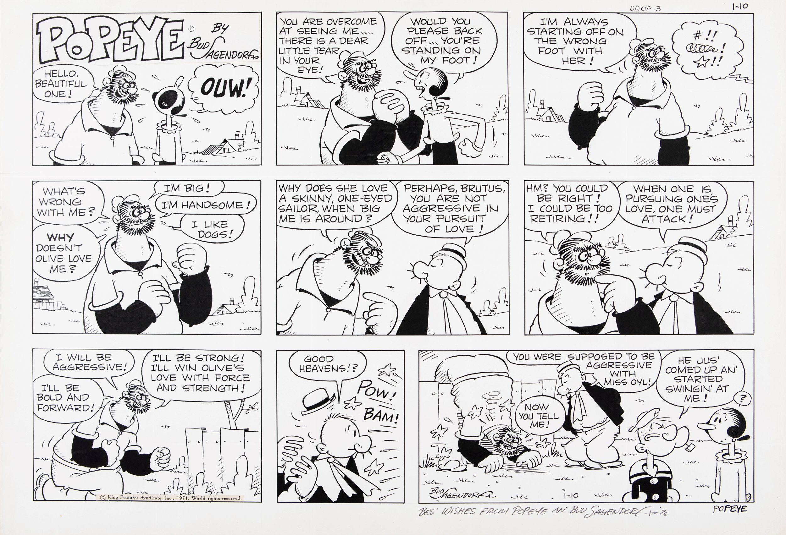 1971 Tavola domenicale del 10/01/1971 per Popeye. Piega orizzontale al centro. Firmata, datata e dedicata.