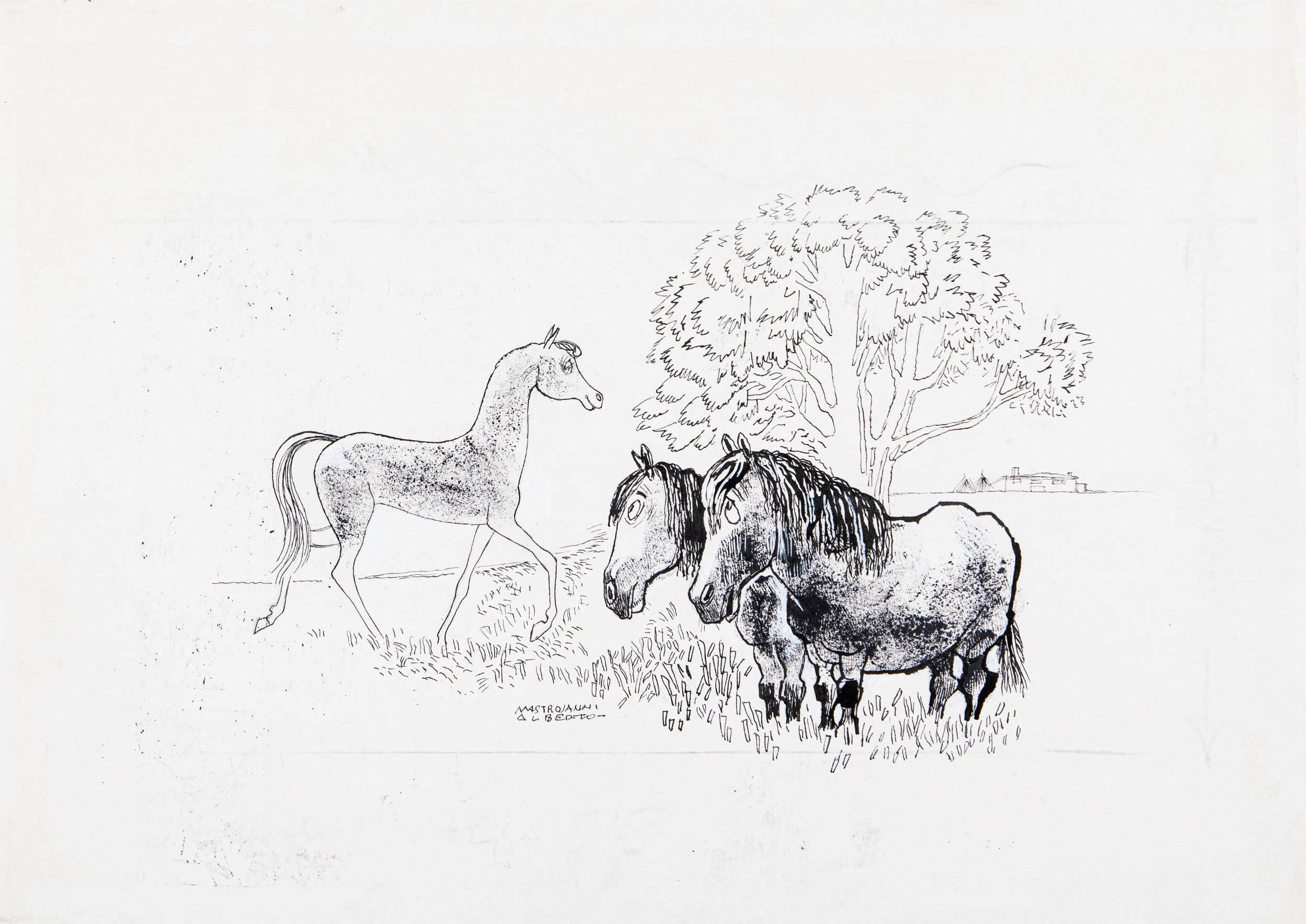 matita, china e biacca su cartoncino, 35 x 25 cm anni ’40 Illustrazione originale realizzata da Mastroianni sul Travaso durante gli anni ’40. << Carina, eh? Si, ma per me ha le gambe troppo lunghe >>. Lieve piega verticale al margine destro. Firmata.