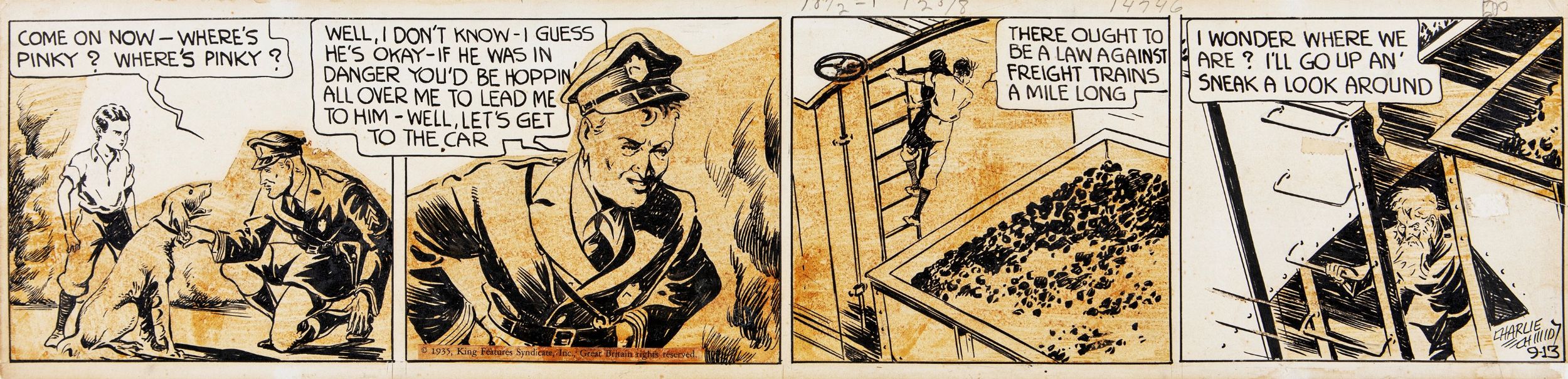 matita e china su cartoncino, 56,5 x 14 cm 1935 Striscia giornaliera del 13/09/1935 per Radio Patrol. Striscia poliziesca nata nel 1933 sulle pagine del Boston Record, Radio Patrol vantava come scrittore Eddie Sullivan, un giornalista di cronaca nera. Piccolo strappo al margine destro. Firmata e datata.