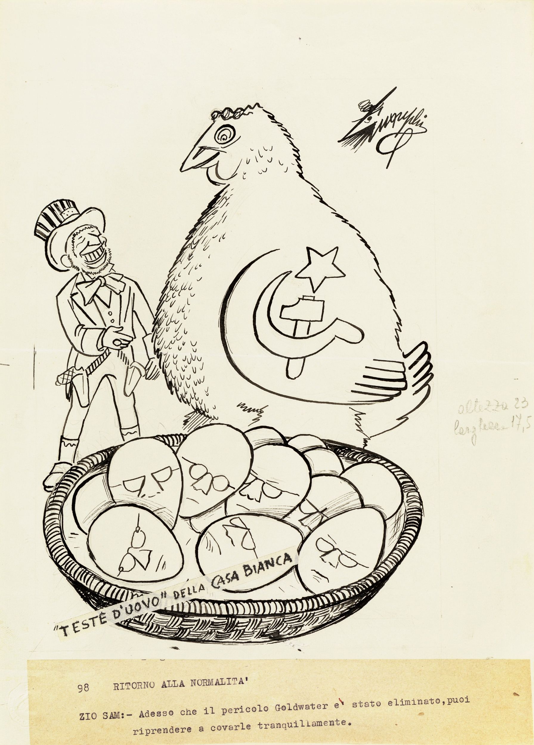 matita e china su cartoncino, 23,5 x 33,5 cm 1964 Illustrazione originale realizzata da Guareschi e pubblicata sulle pagine della rivista Candido il 6 Novembre 1964. << Zio Sam: Adesso che il pericolo Goldwater è stato eliminato, puoi riprendere a covarle tranquillamente. >> Piega orizzontale al centro. Firmata al fronte e datata al retro.
