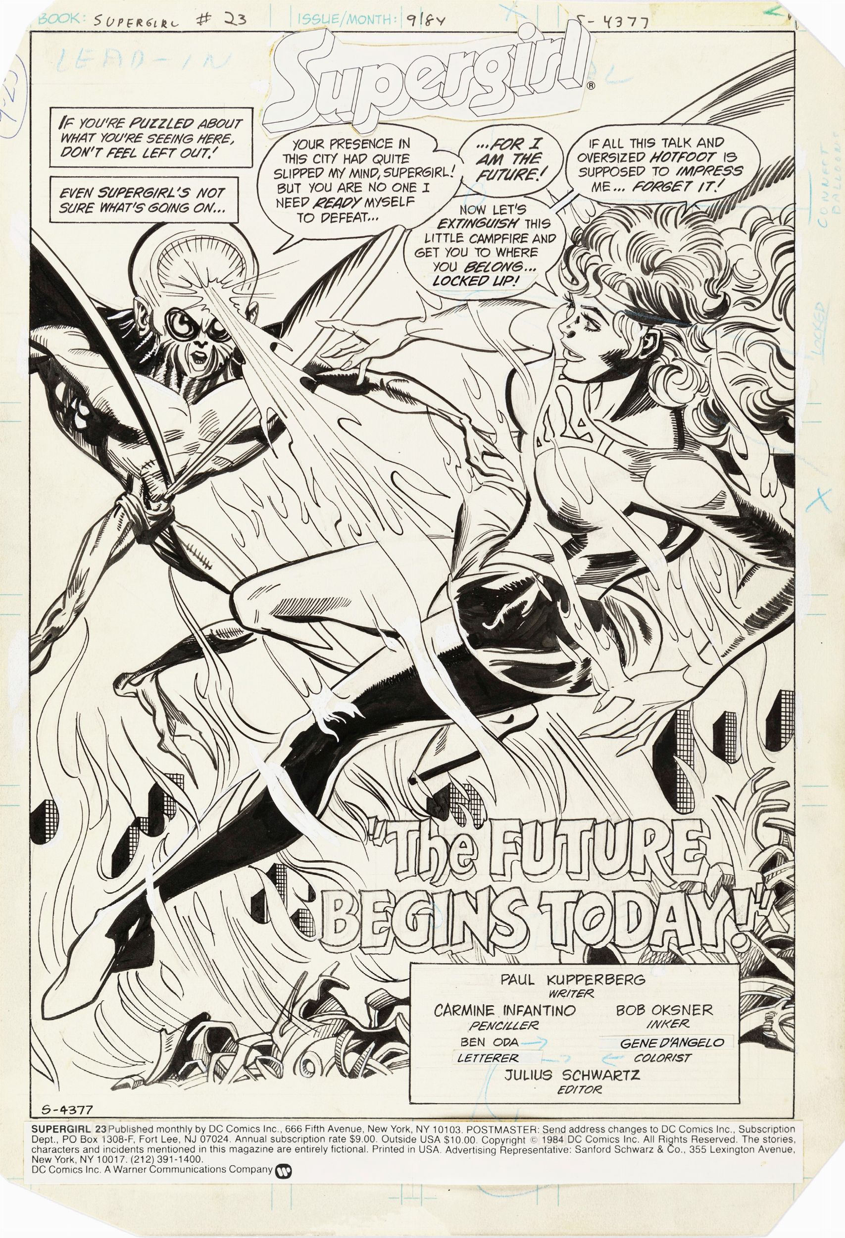 1984 Title page originale realizzata da Infantino per The Future Begins Today!, edita su Supergirl n. 23 dalla DC nel 1984.