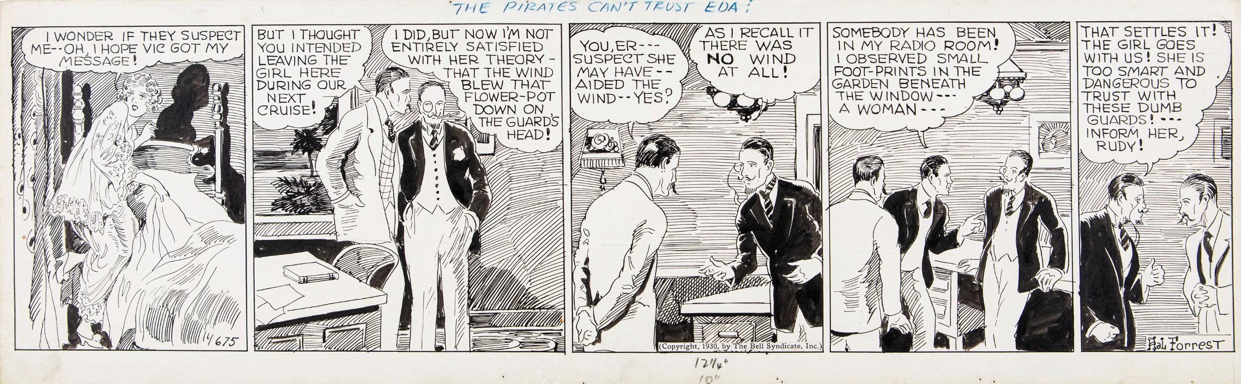 1930 Striscia giornaliera n. 675 del 1930 per Tailspin Tommy. Fori di affissione ai margini. Firmata.
