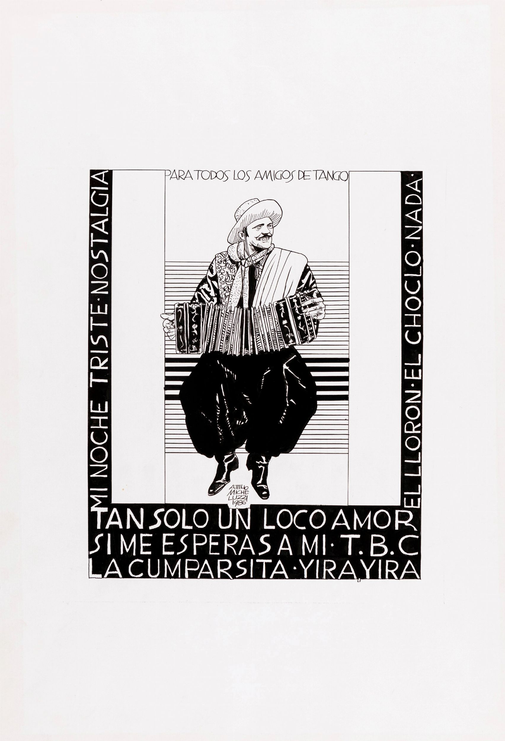matita e china su cartoncino, 34,5 x 50 cm 1986 Originale di copertina realizzato da Micheluzzi e pubblicato sul settimanale di satira politica Tango n. 26, uscito come supplemento a L´Unità dell'8 Settembre 1986. Opera pubblicata nel portfolio I Tanghi di Tango edito dal Grifo Editore nel 1987. Piccolo strappo al margine sinistro. Firmato e datato.