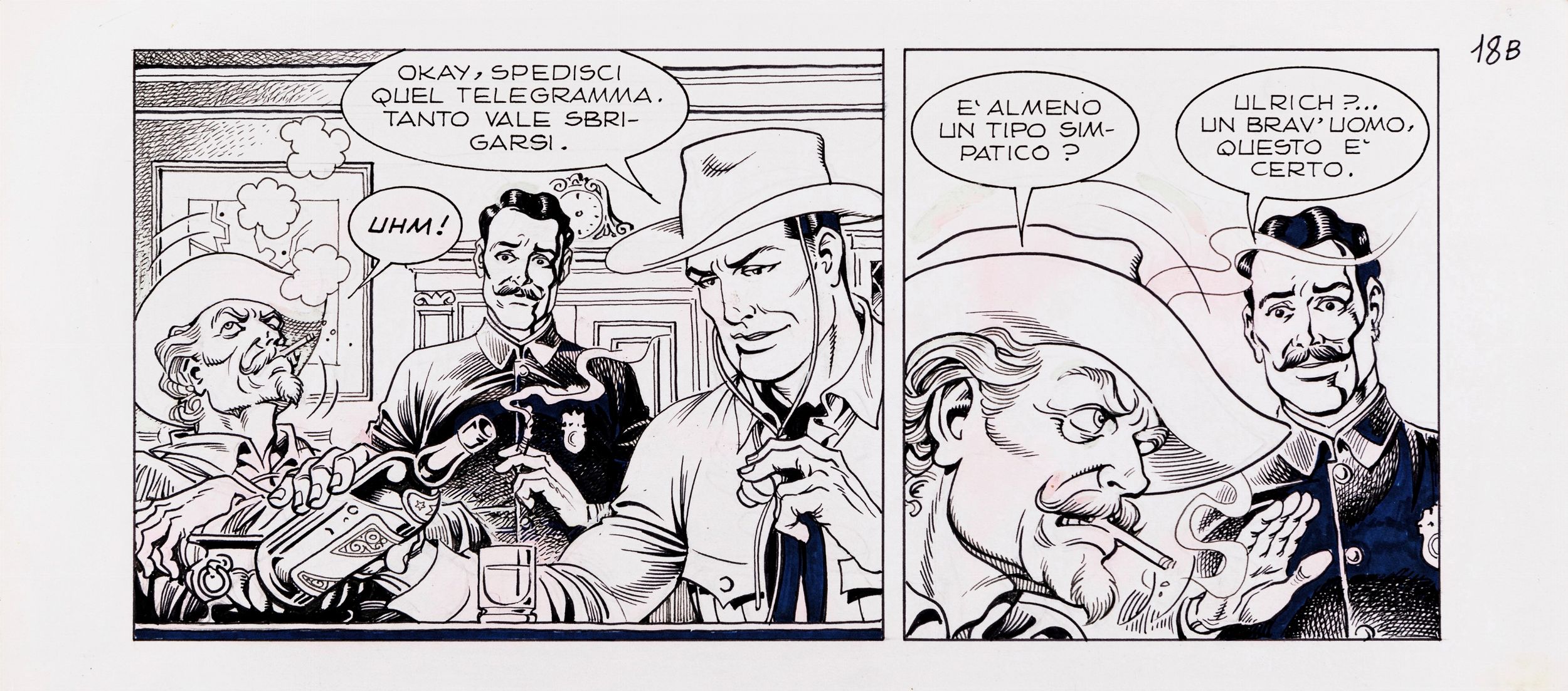 matita e china su cartoncino, 35 x 15,5 cm 1996 Striscia originale (18 B) realizzata da Magnus per il suo eterno capolavoro La valle del terrore, edita sul Texone n. 9 a pag. 18 dalla Bonelli nel 1996. Nel 1989 il maestro bolognese decise di rifugiarsi sull’Appennino Tosco Emiliano a Castel del Rio per dedicare tutto sè stesso alla realizzazione di un’opera monumentale: il suo Tex. Un lavoro lunghissimo ed estenuante per lo stesso autore, che spingerà Magnus ad un perfezionismo maniacale portandolo a ridisegnare più volte le stesse pagine alla ricerca di una perfezione impossibile da raggiungere per chiunque altro. Le tavole del Texone di Magnus non sono mai apparse sul mercato e fino ad oggi sono circolati semplici studi preparatori, Magnus decise di applicare sulla tavola definitiva una fotocopia di questa striscia poichè il pennino utilizzato aveva virato colore in alcuni punti del disegno apportando al contempo alcune modifiche, dandoci così la possibilità di poter custodire un pezzo di storia del fumetto mondiale. Lievi aloni rossastri causati dal viraggio della china utilizzata dall’autore.