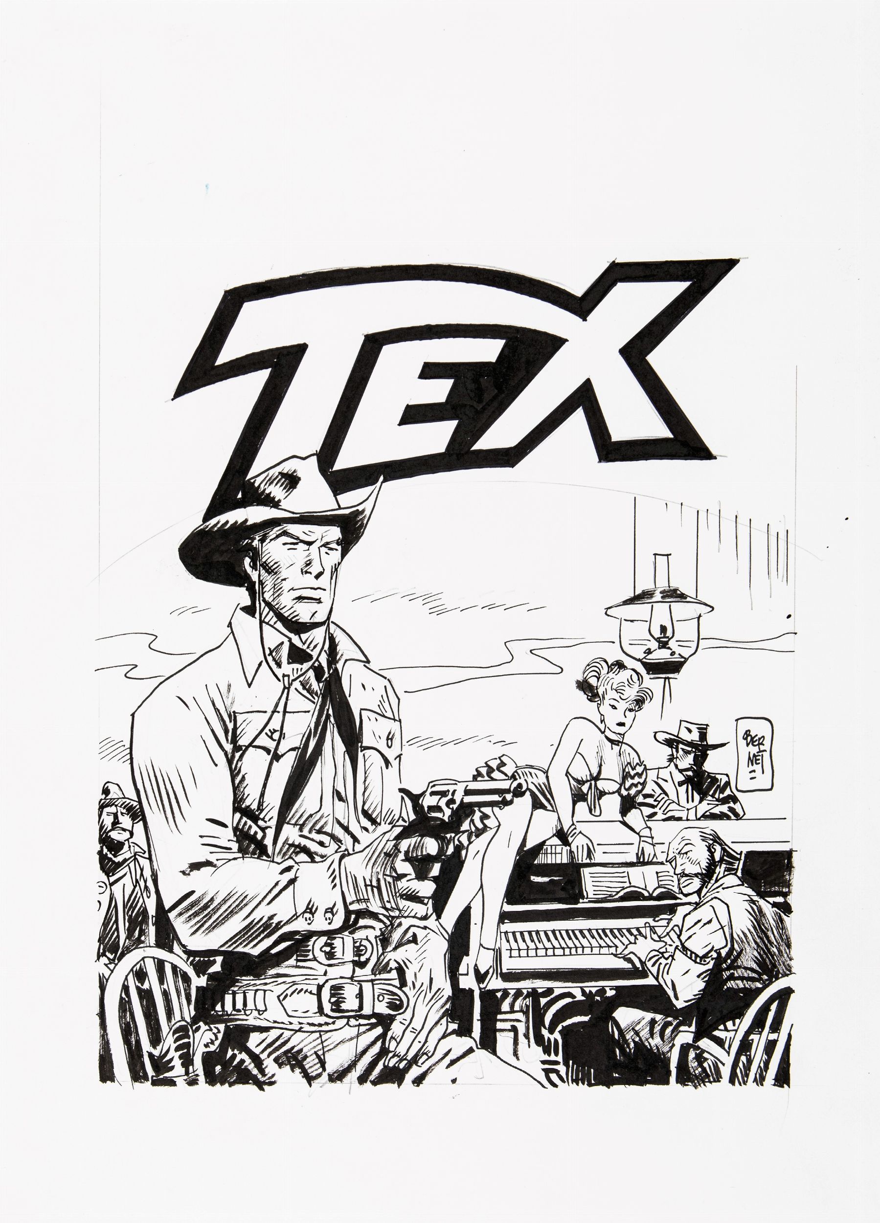 matita e china su cartoncino, 29,5 x 40,5 cm 2017 Originale di copertina realizzato da Bernet per la versione olandese del suo Texone L'uomo di Atlanta, intitolato De Man van Atlanta e edito dalla casa editrice olandese Uitgeverij Hum nel 2017. Firmato.