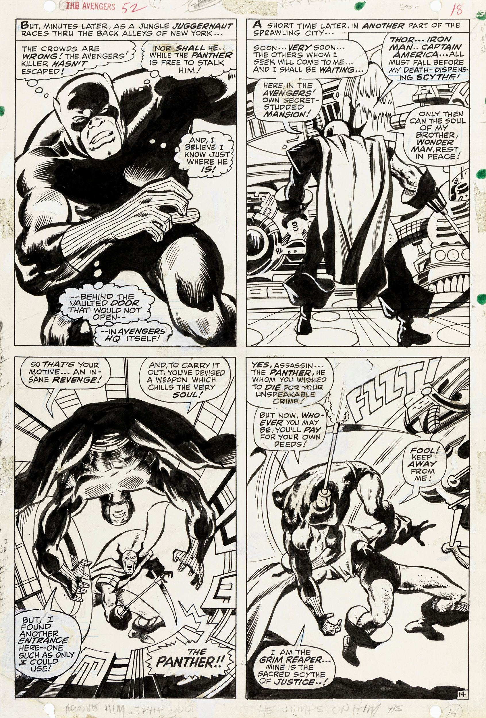 matita e china su cartoncino Marvel, 27,5 x 41 cm 1968 Tavola originale realizzata da Buscema per Death Calls for the Arch-Heroes!, edita su The Avengers n. 52 a pag. 14 dalla Marvel nel 1968. Un'incredibile sequenza di combattimento tra Black Panther e il villain Grim Reaper (qui alla sua prima apparizione
