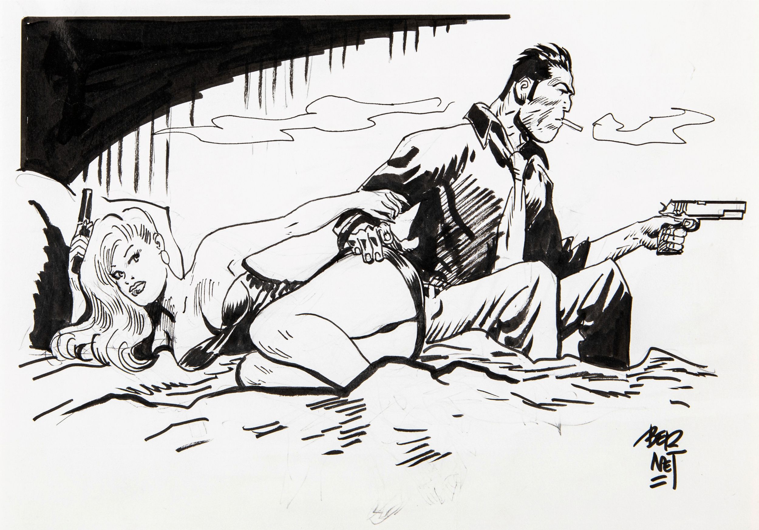 matita e china su cartoncino, 29,5 x 21 cm anni 2000 Illustrazione originale realizzata da Bernet per il suo Torpedo, qui in compagnia della dolce Susie. Antieroe per antonomasia, Torpedo è protagonista di uno dei fumetti noir più amati e celebrati dal pubblico di tutto il mondo che rese l’artista spagnolo