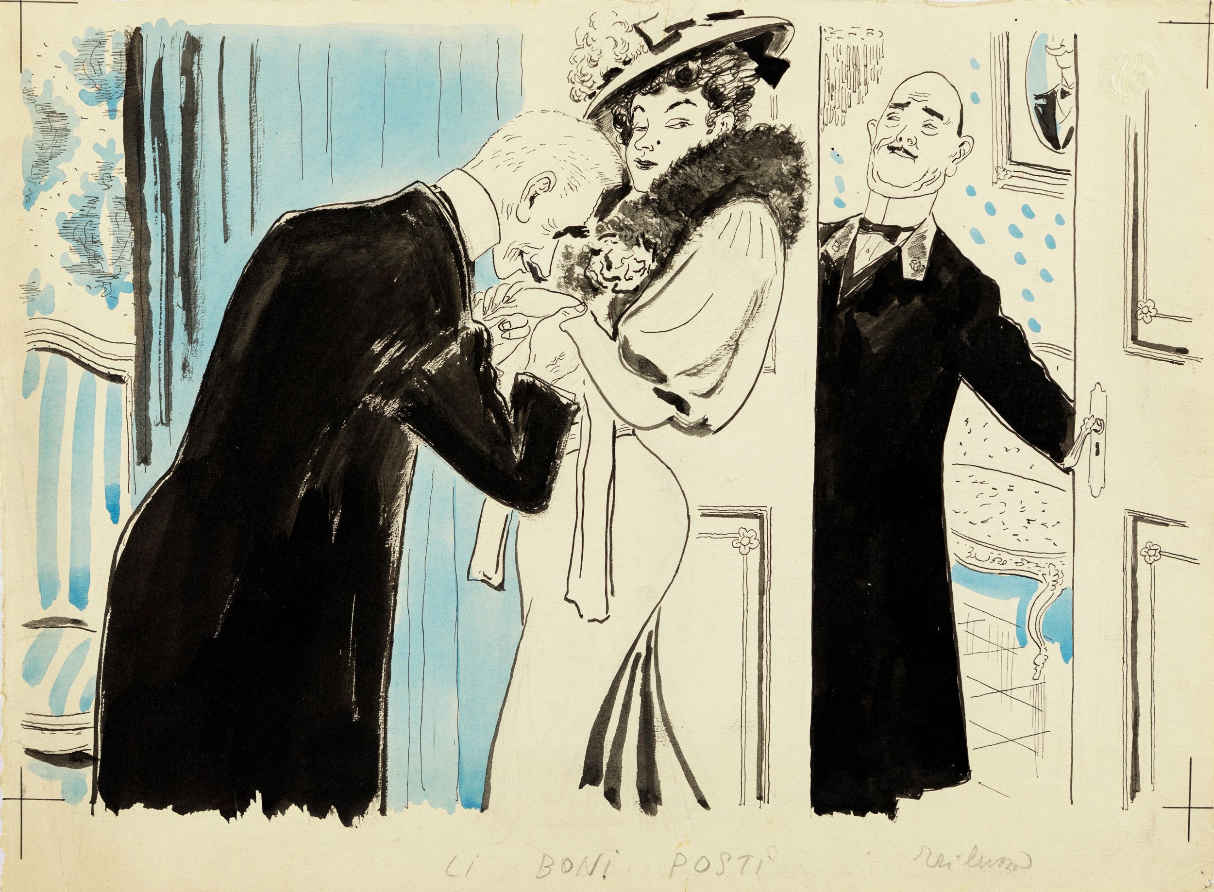 anni '30 Illustrazione originale realizzata da Apolloni a corredo di una poesia di Trilussa intitolata Li boni posti, edita su Il Travaso negli anni '30. Acquerellata al retro.