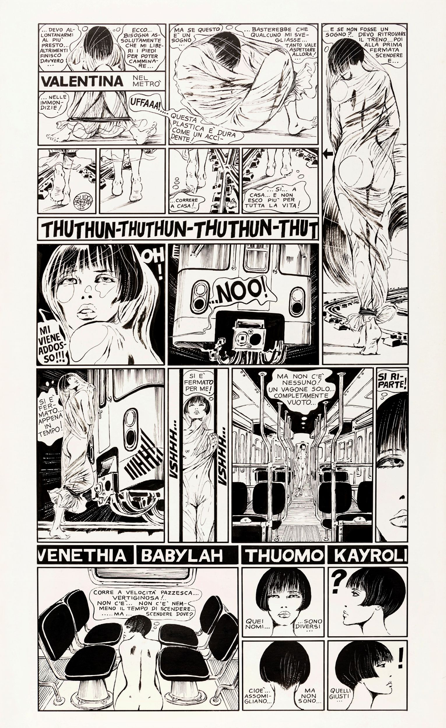 matita e china su cartone, 43 x 70 cm 1975 Tavola originale realizzata da Crepax per Valentina nel metṛ, pubblicata a pagg. 25 - 26 per la prima volta sulla rivista Linus nel 1975. Un viaggio nella follia della metropolitana Milanese, una vacanza che accende i ricordi e svela segreti di famiglia, due occasioni per Valentina di incrociare la strada dei grandi personaggi del fumetto, in quello che è un lungo atto d'amore di Guido Crepax verso la nona arte. Di grande rarità. Firmata e datata.