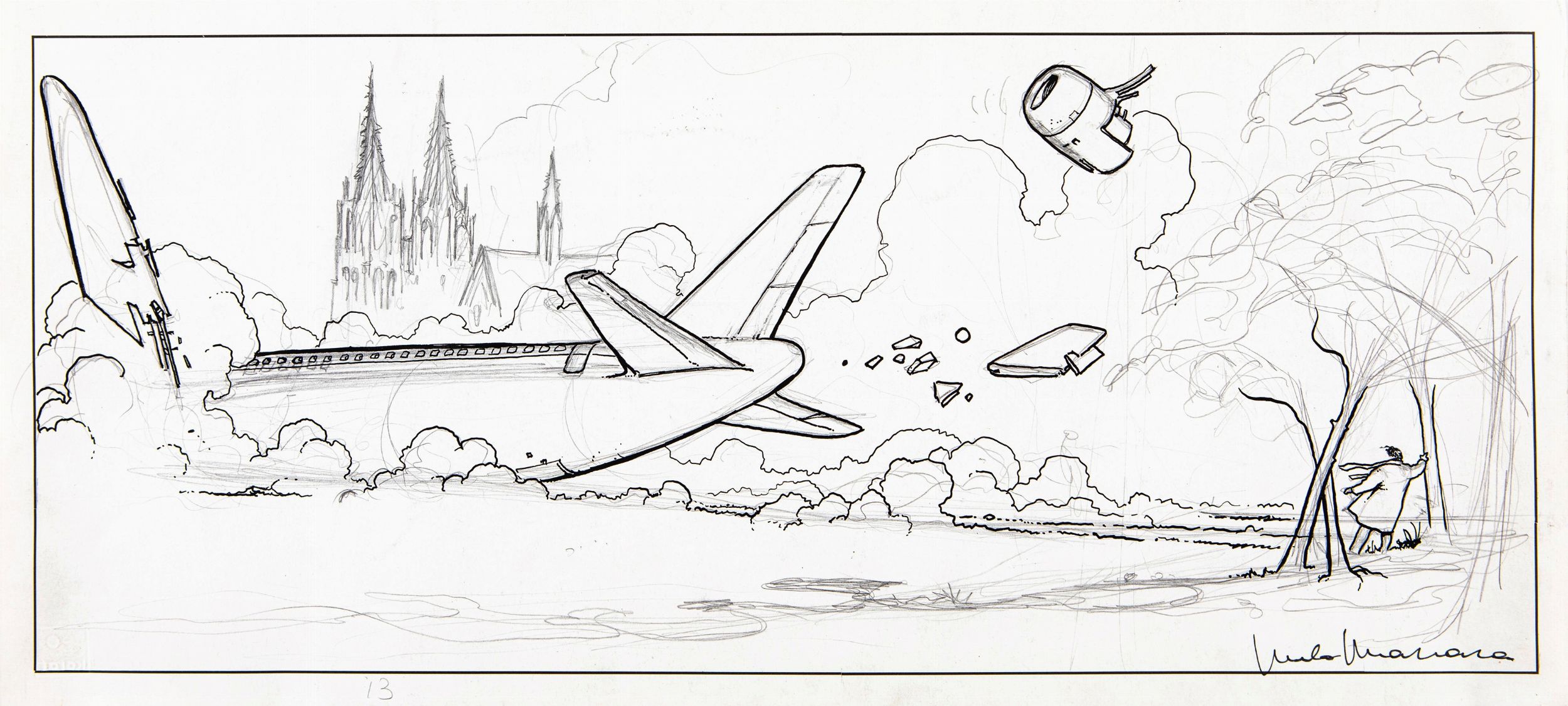 matita e china su cartoncino, 48 x 22 cm 1986 Striscia originale inedita realizzata da Manara per Viaggio a Tulum celebre storia apparsa per la prima volta a puntate sulle pagine del Corriere della Sera nel 1986 e successivamente sulla rivista Corto Maltese nel 1989. Sulla sceneggiatura di Fellini Viaggio a Tulum, in un´atmosfera surreale e magica, ripercorre il racconto vero di un viaggio in Messico alla ricerca del set per un film maledetto che il regista non riuscì mai a realizzare. Firmata.