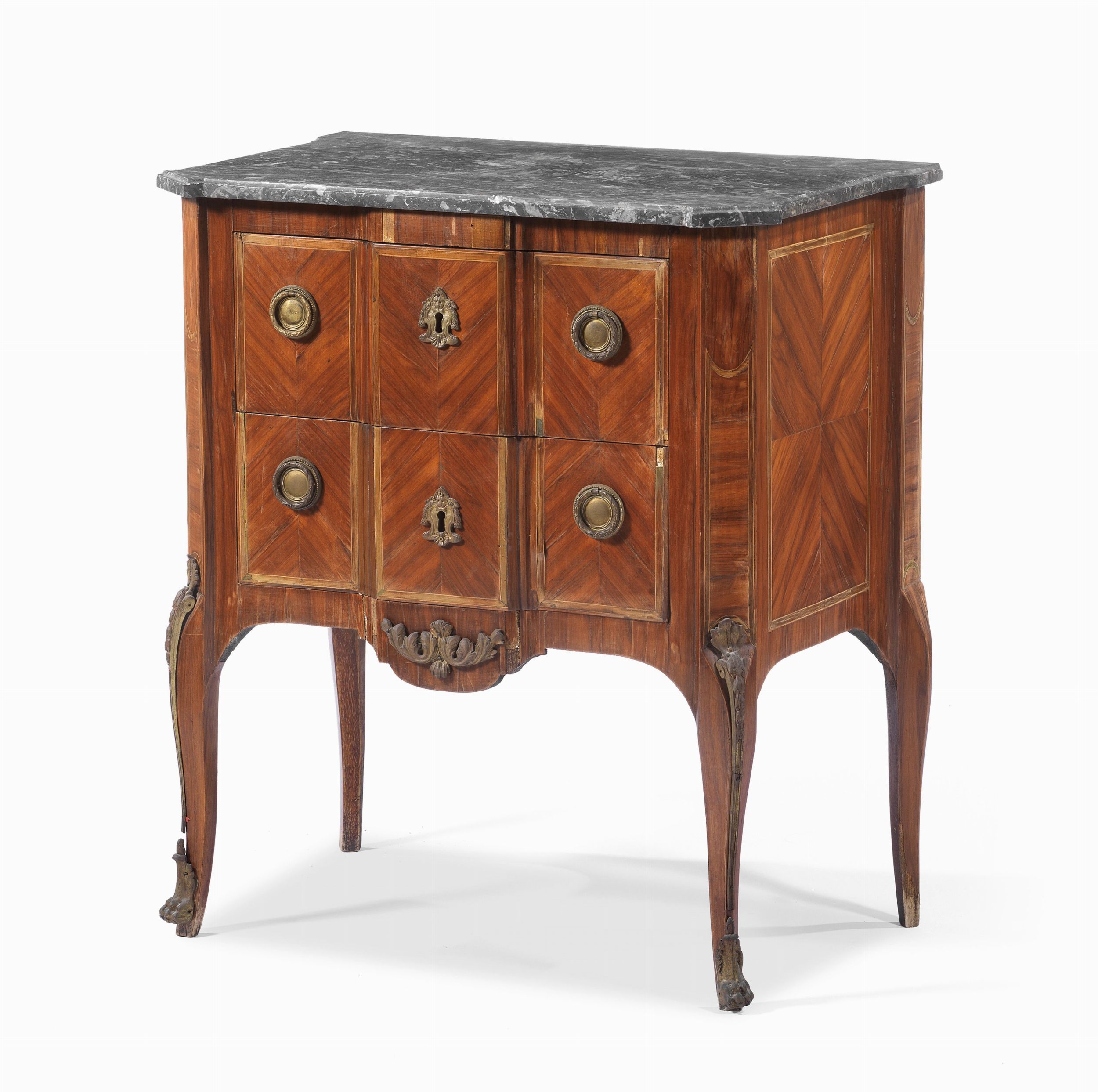 Comodino Luigi XVI lastronato a spina di pesce con legni vari