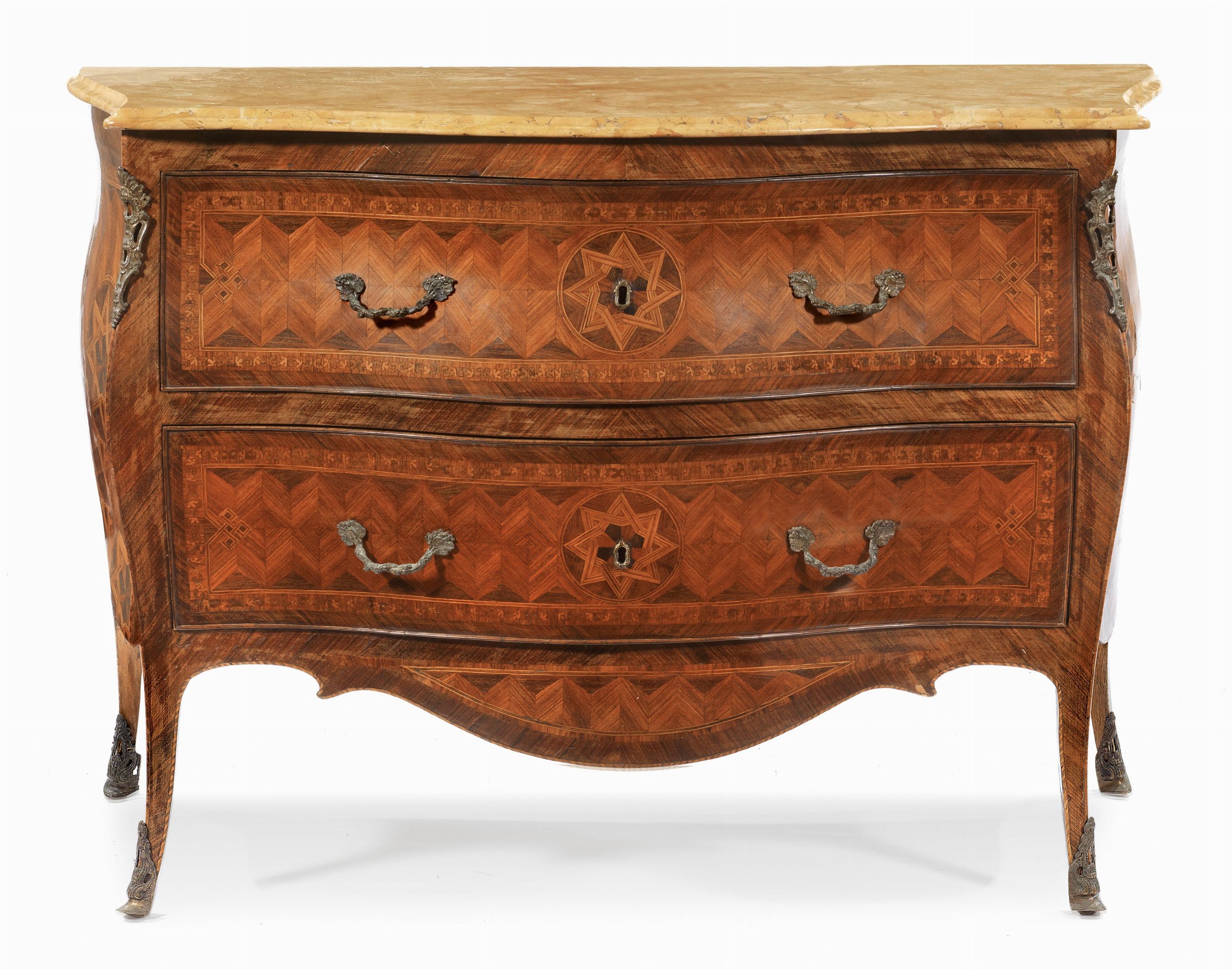 Coppia di commode lastronate e finemente intarsiate in noce e legni vari
